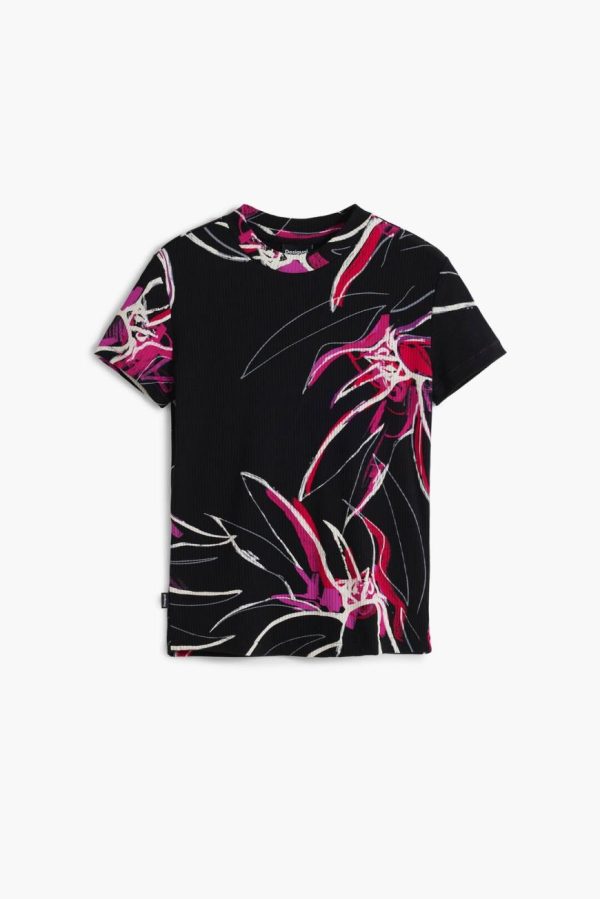 Ribbed short-sleeve T-shirt with a round neck and abstract floral stroke print.