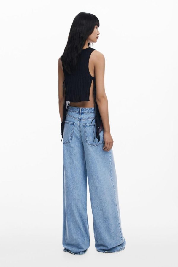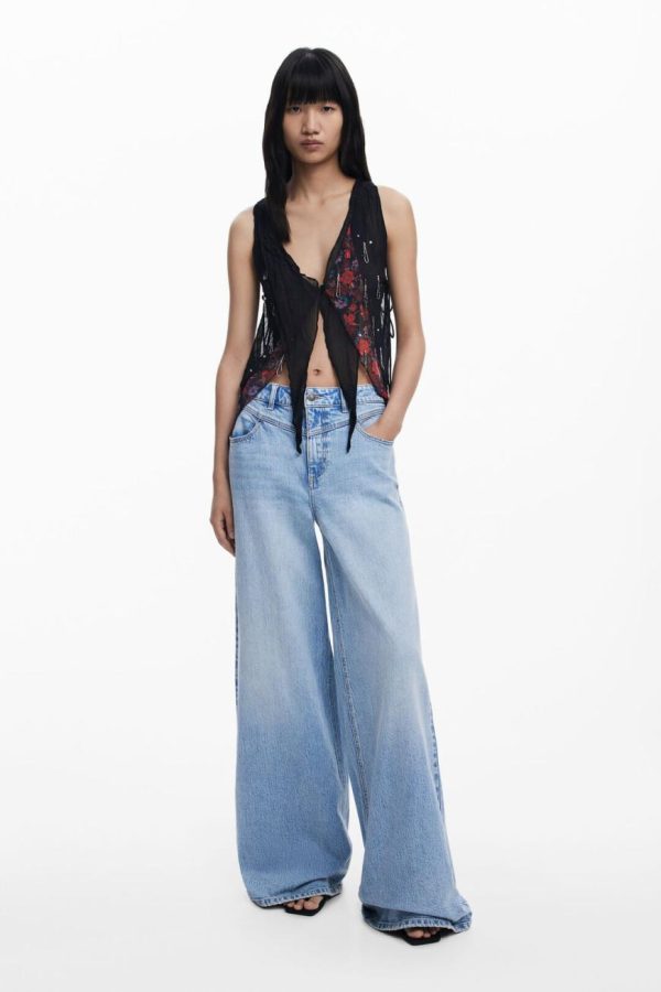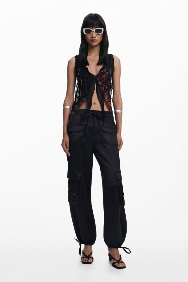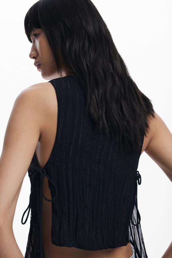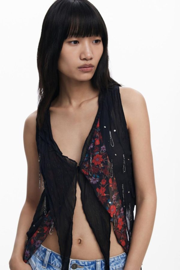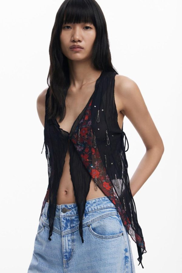 Blouse in patchwork-effect chiffon fabric, sleeveless, V-neck, asymmetrical front, button closure, side tie details, and decorative appliqués.