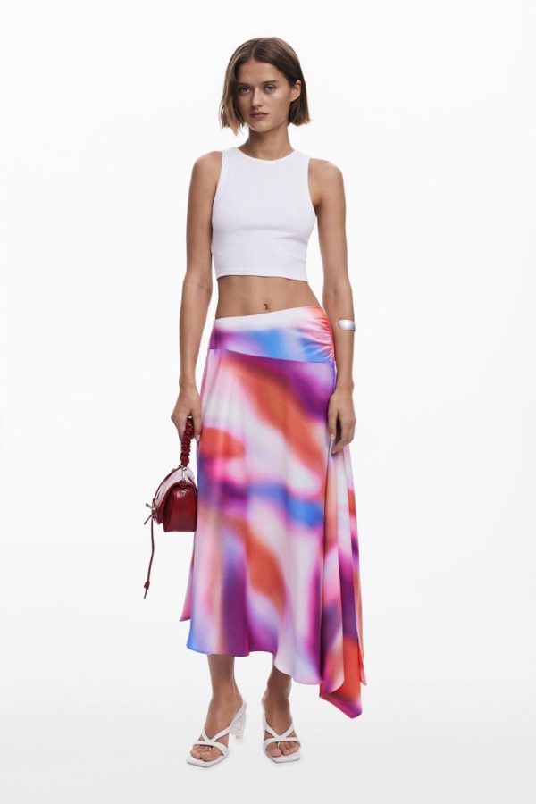 Long skirt with an asymmetrical cut, draping at the waist, and gradient color print.