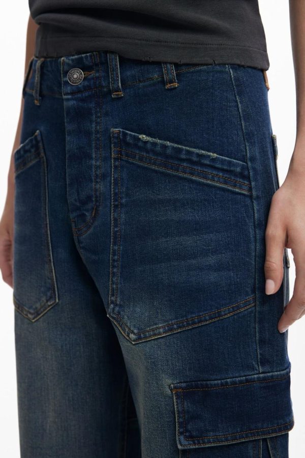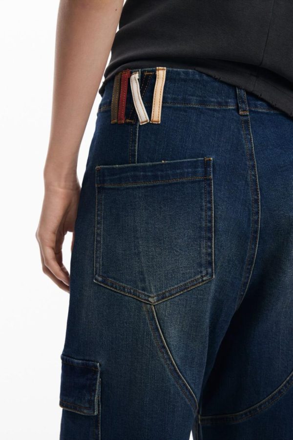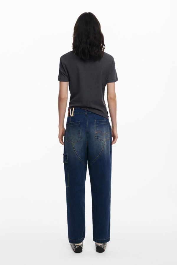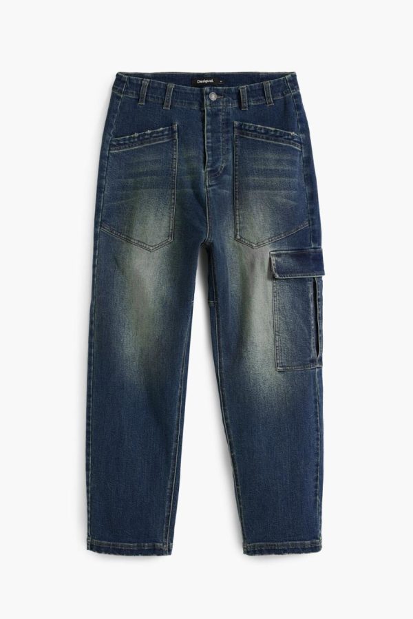 Long baggy jeans with a washed effect, pockets on the legs, and belt loop details in leather effect.