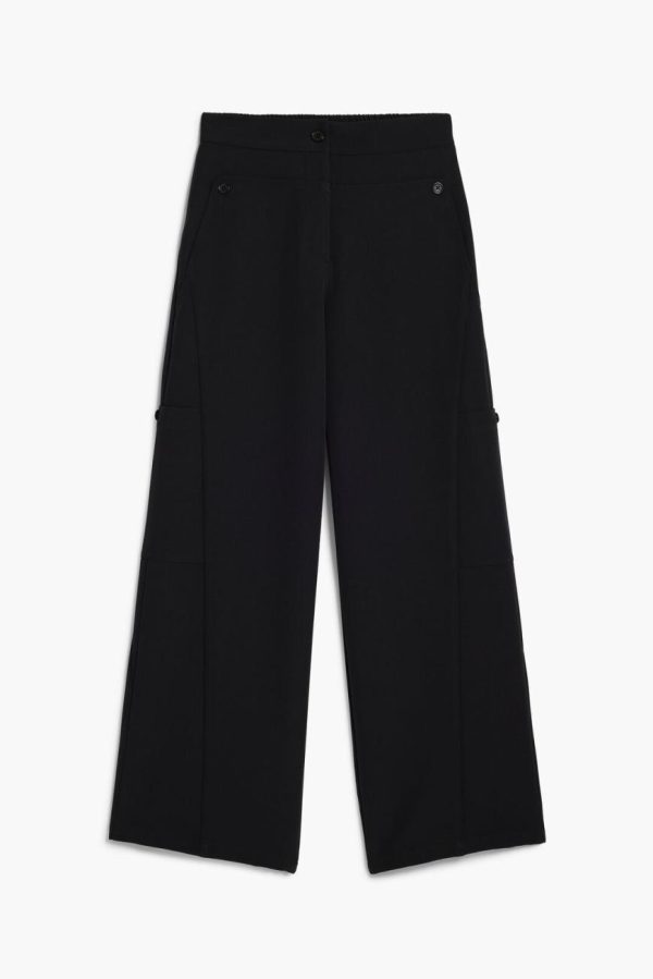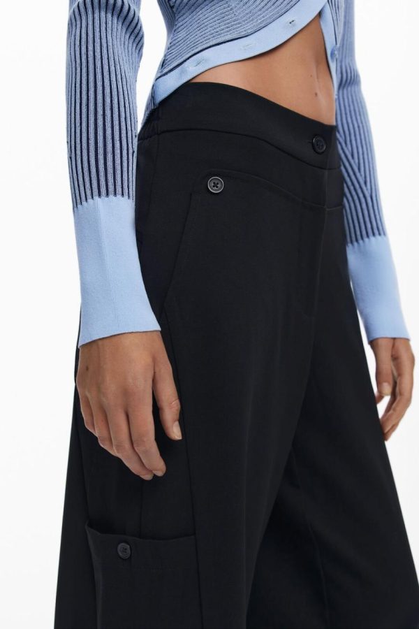 Balloon-cut tailored long pants, multiple side pockets, and zip and button closure in solid color.