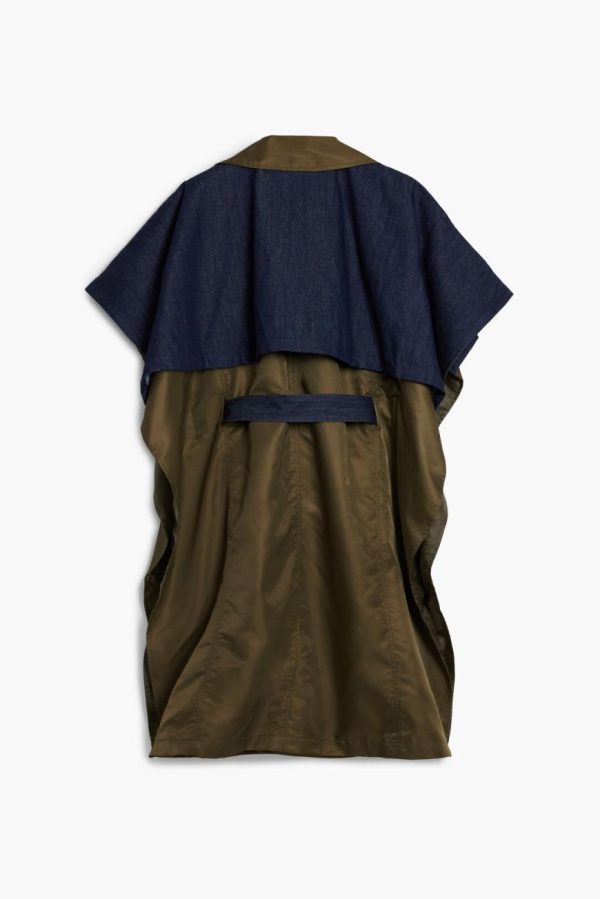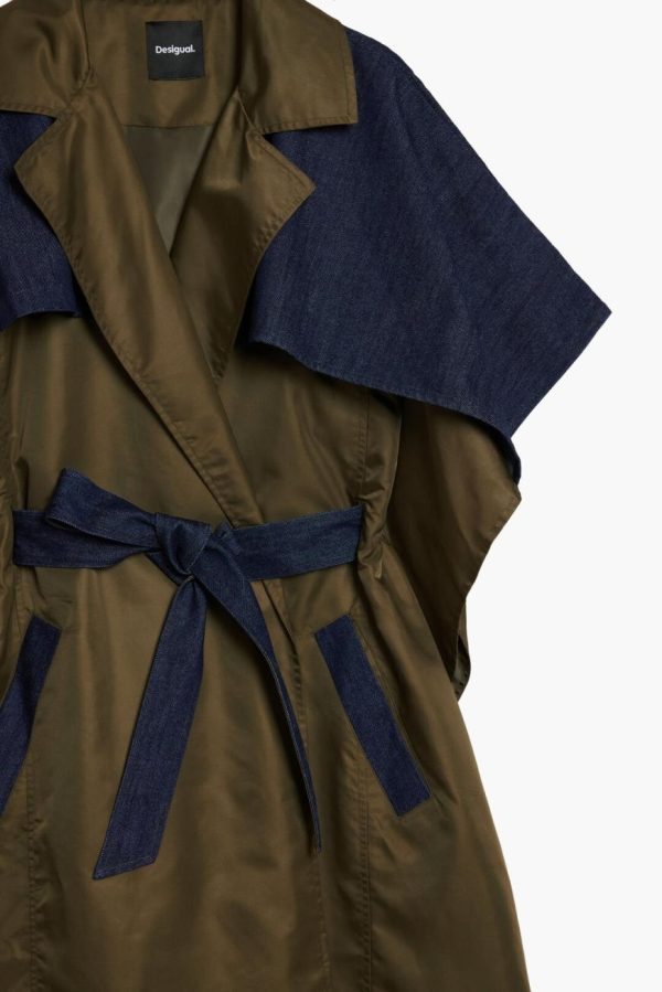 Long trench-style poncho combined with denim, front pockets, and bow-type belt.