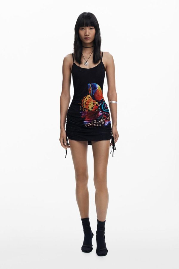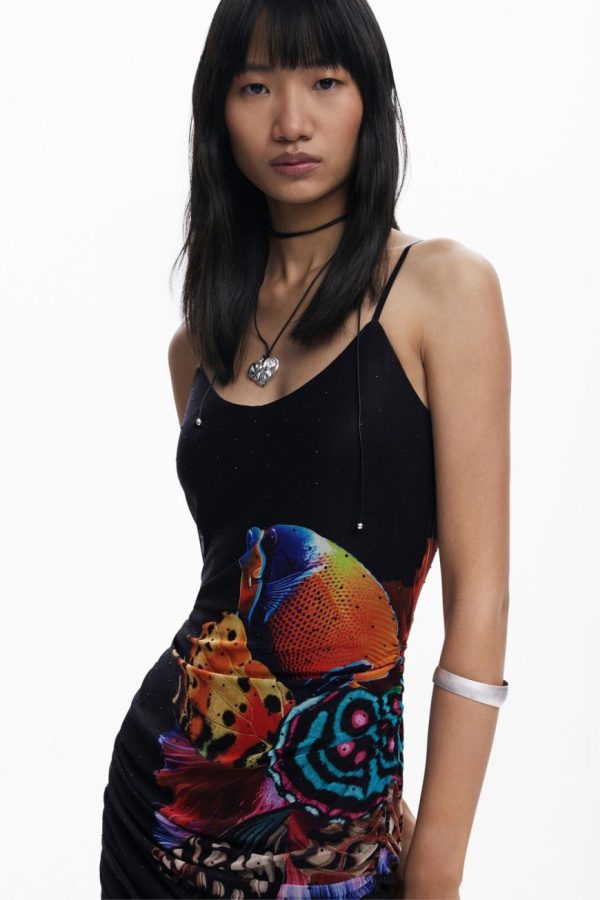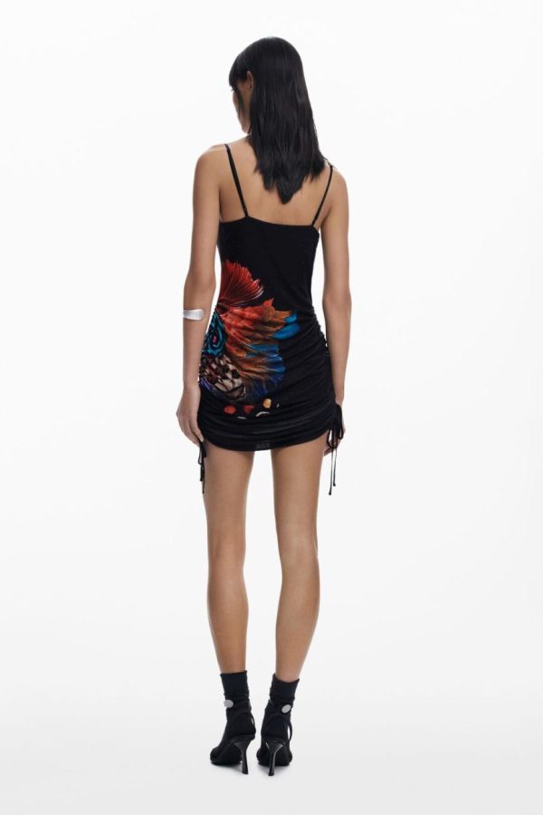 Discover this stunning fitted short dress featuring delicate straps and a flattering V-neckline. The side draping with adjustable cords creates a customizable silhouette, while the exclusive butterfly and feather print showcases Monsieur Christian Lacroix’s iconic design artistry.