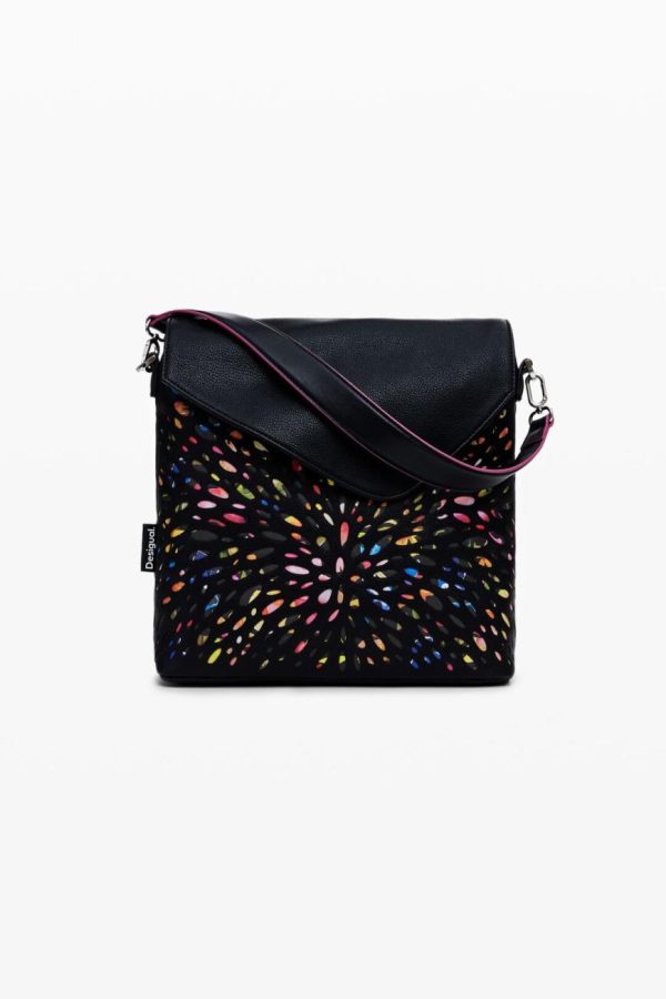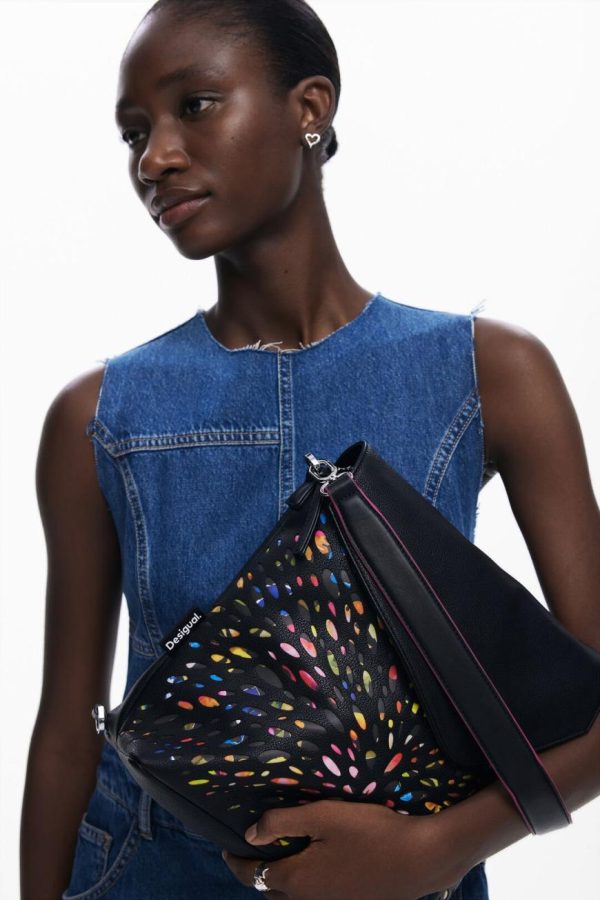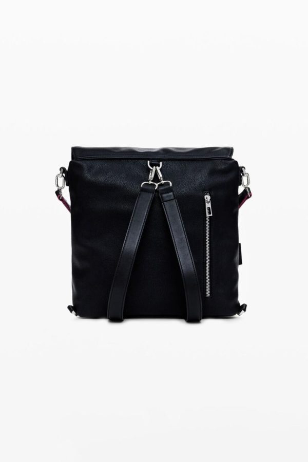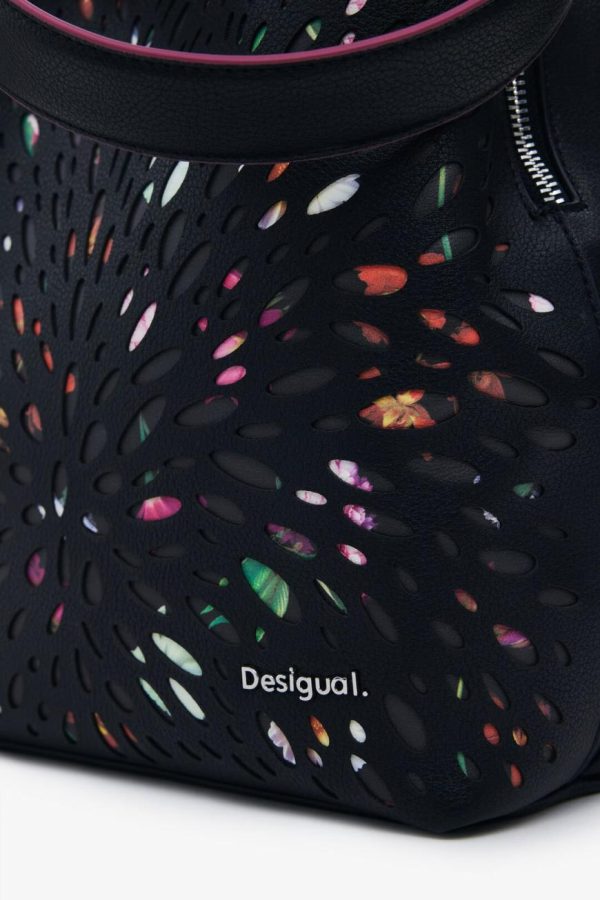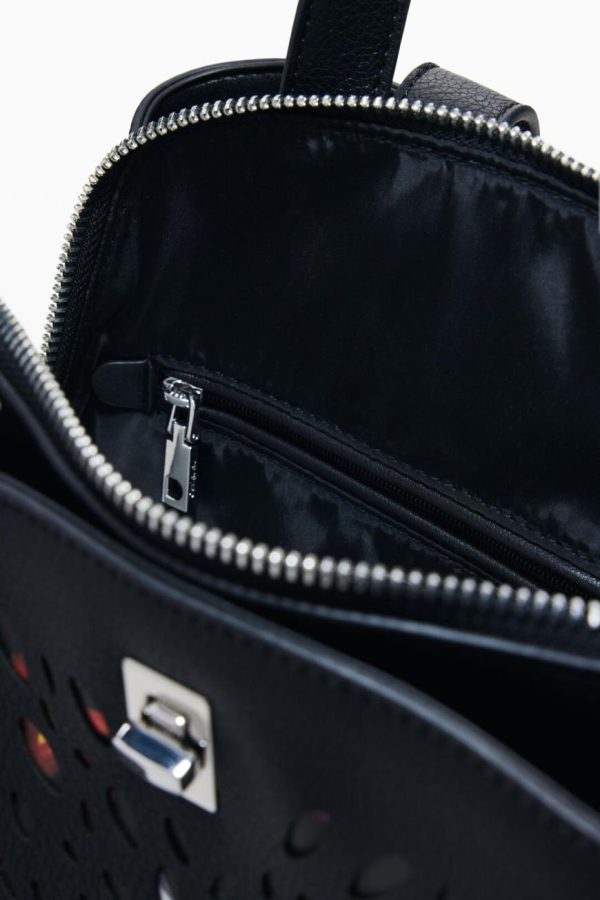 Discover this chic mini backpack crafted from premium faux leather featuring an eye-catching solid black color with artistic perforations that reveal a vibrant stained glass-inspired background pattern. This versatile piece includes a detachable short handle, allowing you to effortlessly convert it into a stylish shoulder bag for multiple carrying options.