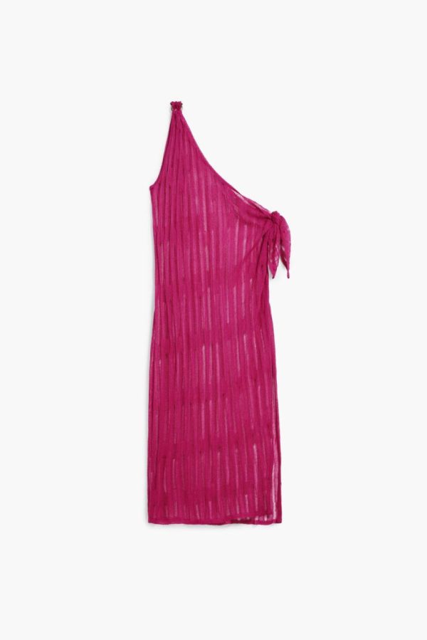 Midi wrap dress with eyelet fabric, one-shoulder design, and solid color wooden ring detail.