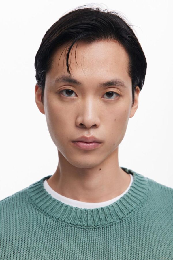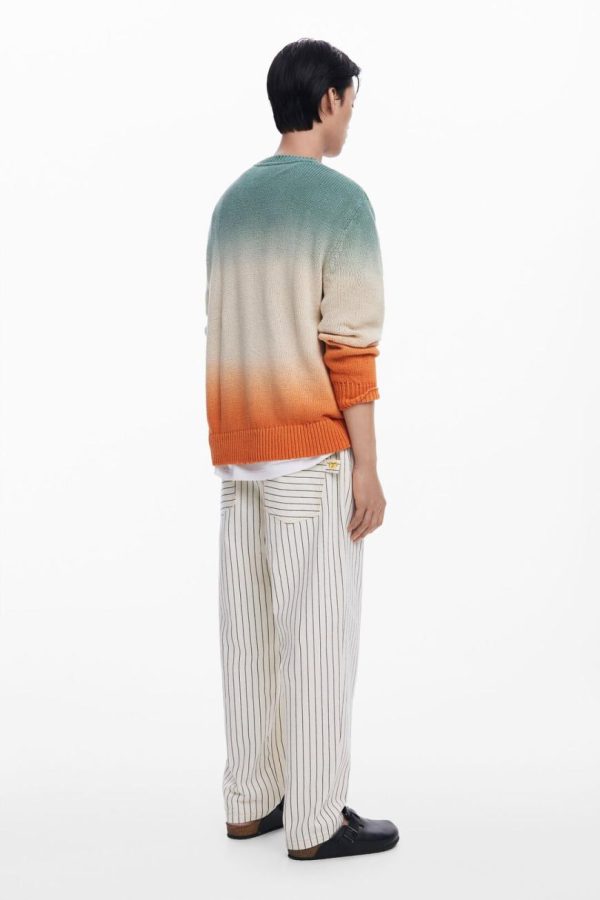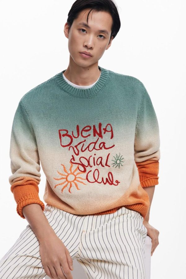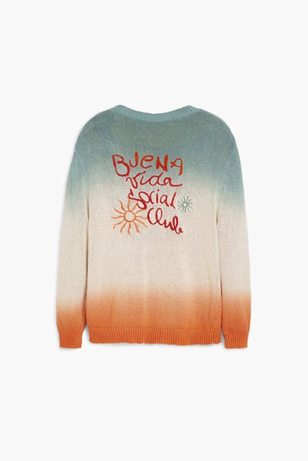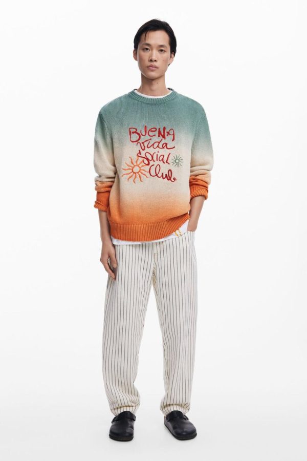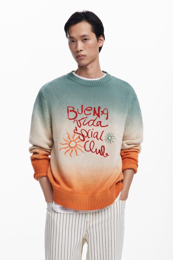 Long-sleeve sweater with a round neck, color gradient, letter and sun print, and distressed hem.