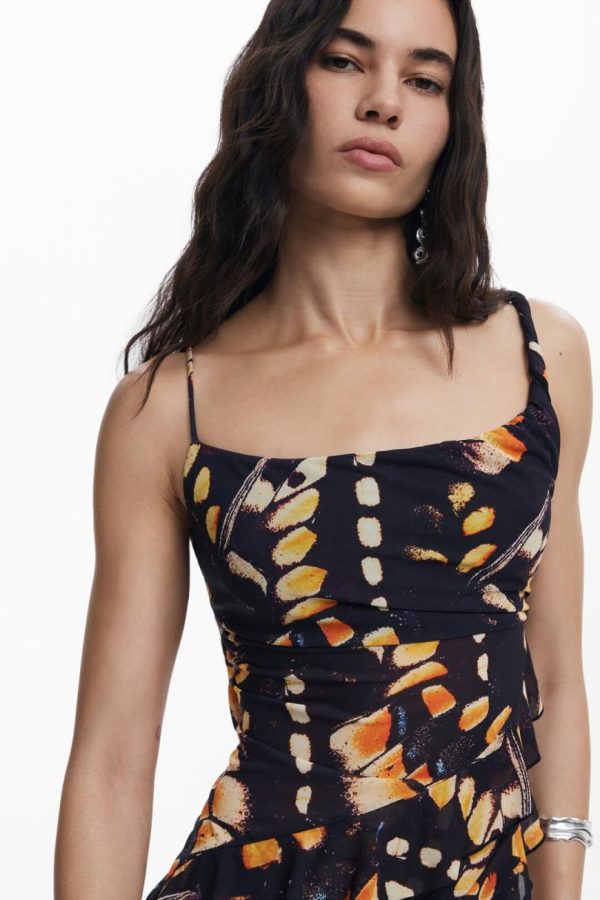 Make a statement with this eye-catching sleeveless top featuring a flattering round neckline, asymmetrical ruffle detailing, and a vibrant butterfly print with a contemporary pointed hem finish.