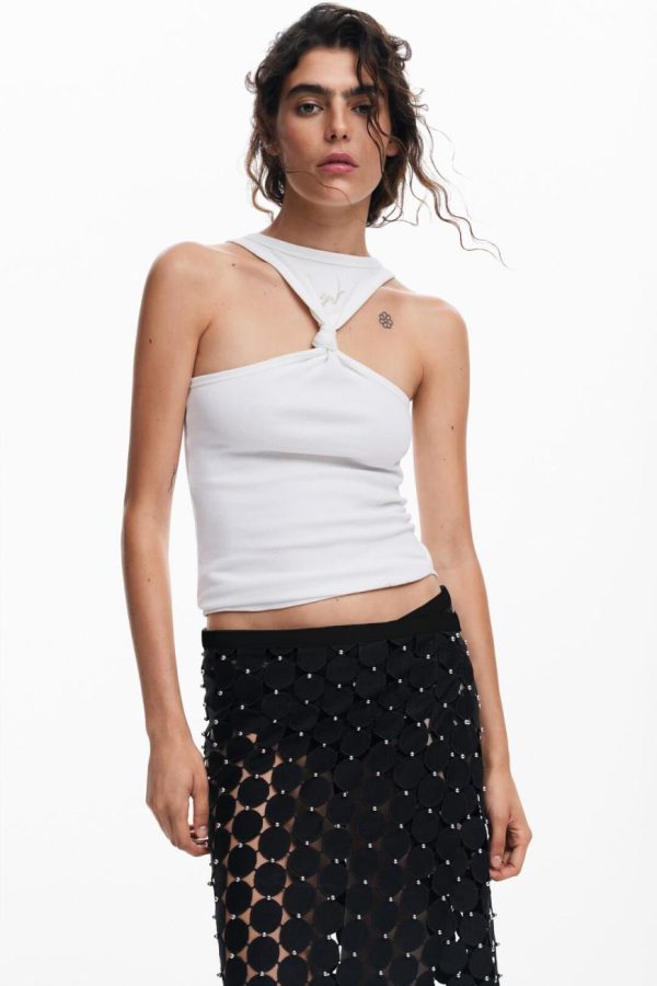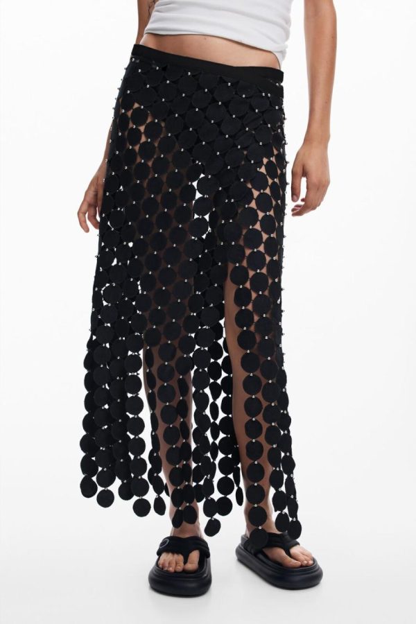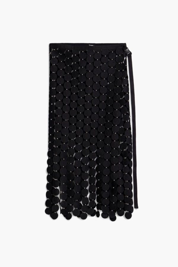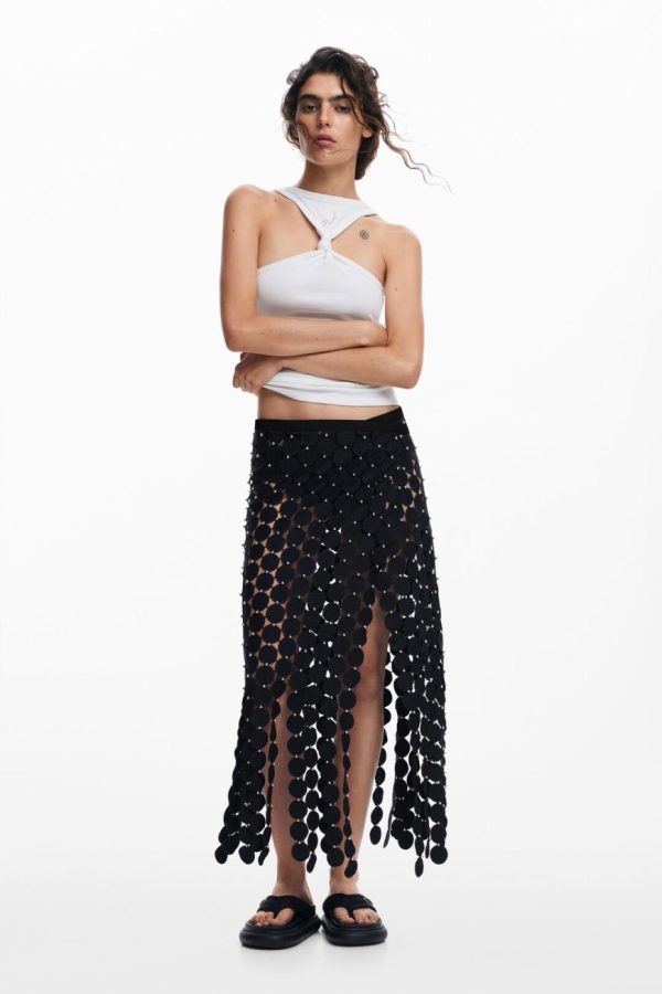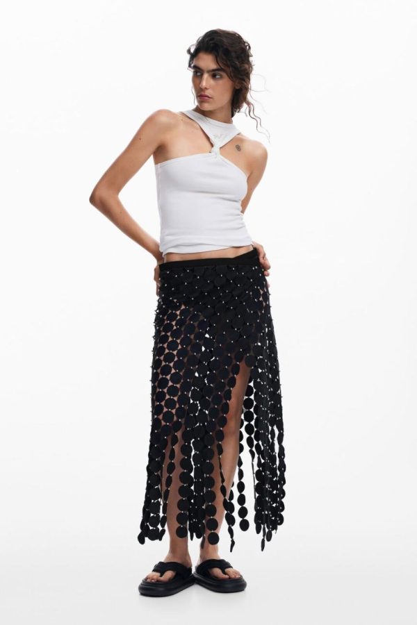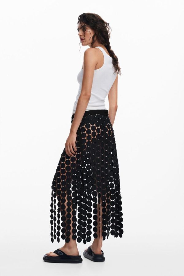 Rigid crochet wrap skirt with individually hand-woven pieces