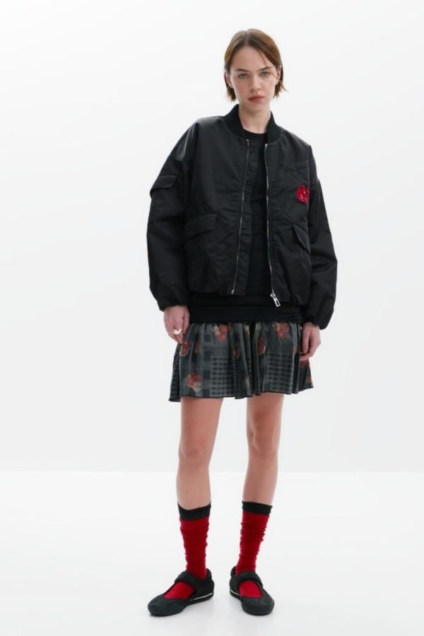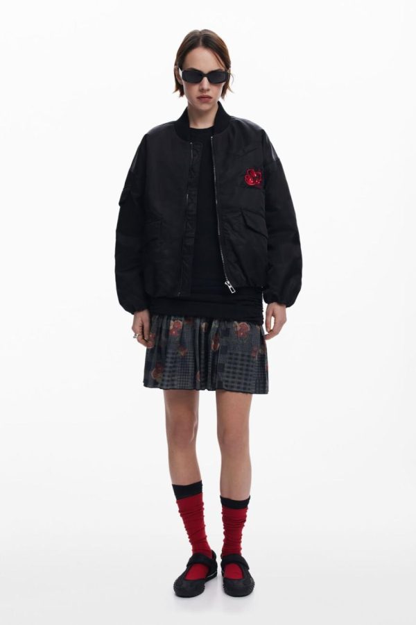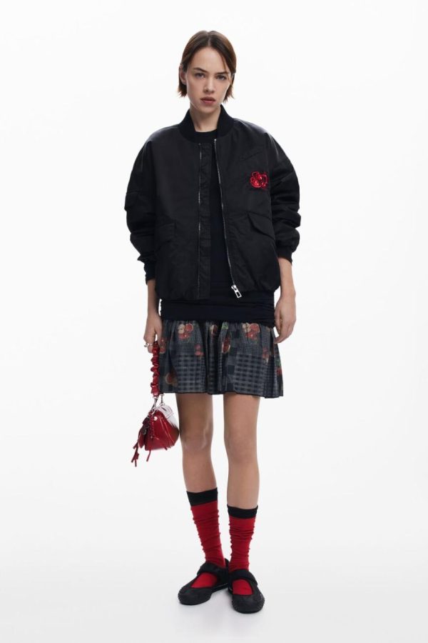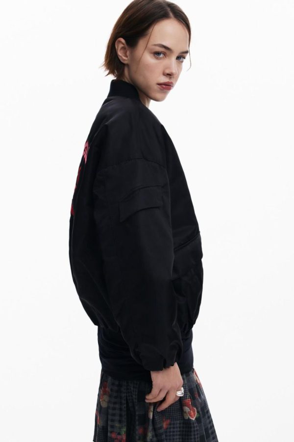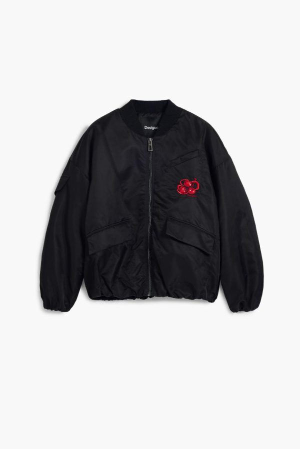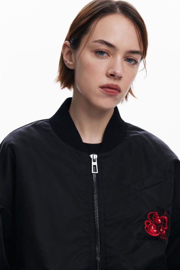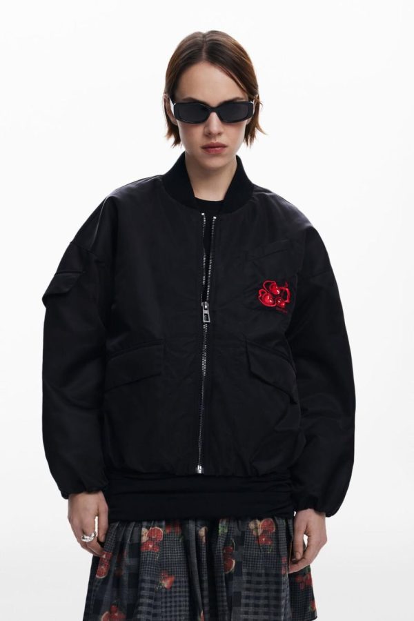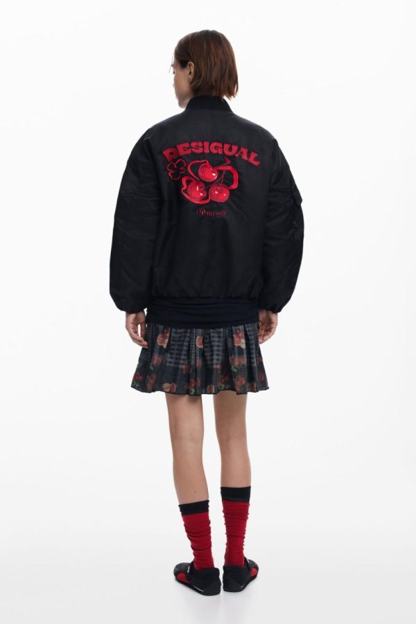 Bomber-style jacket with ribbed collar, zipper closure, and logo and cherry print.