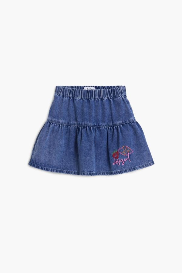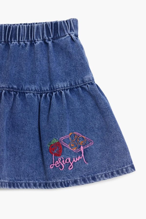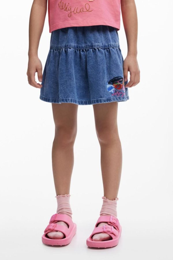 Short denim skirt in cotton fabric, with horizontal panels, elastic waistband, distressed effect, and decorative embroidery.