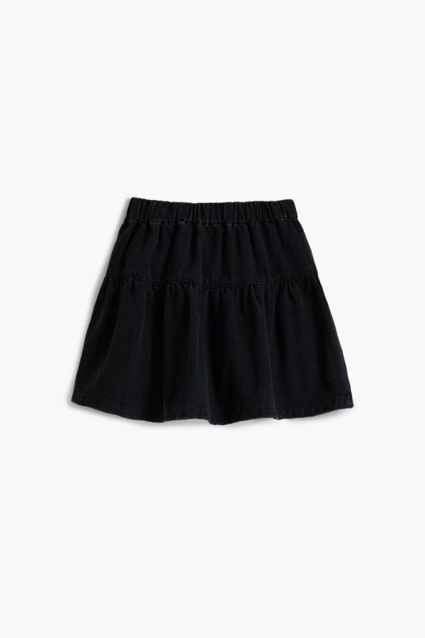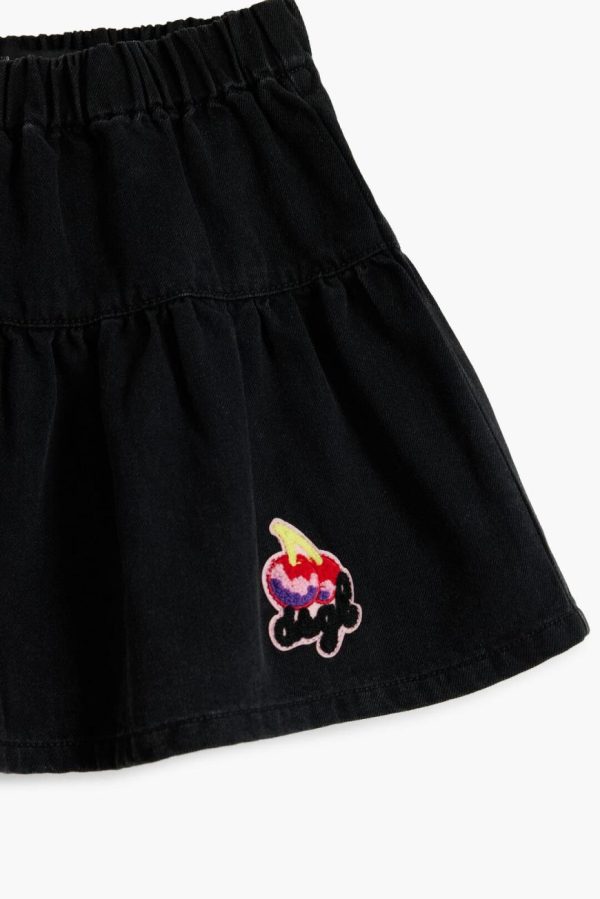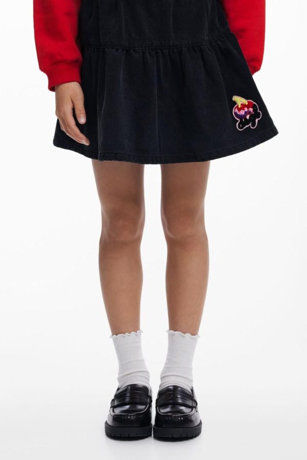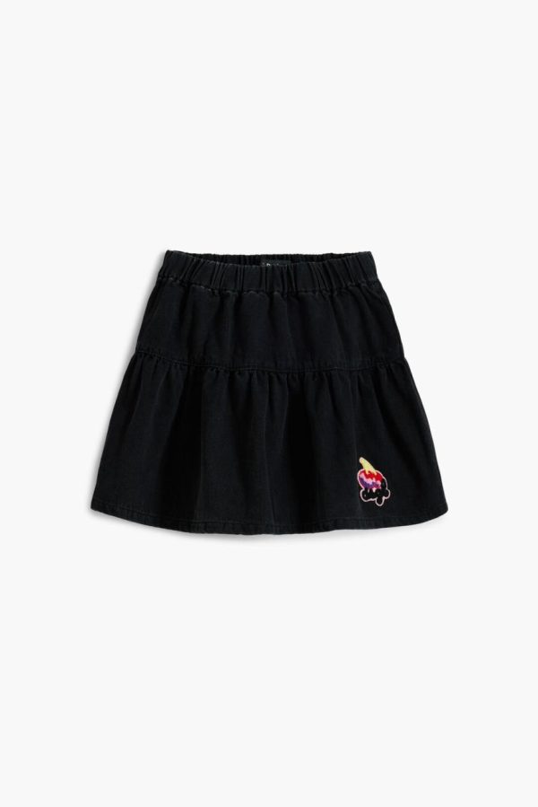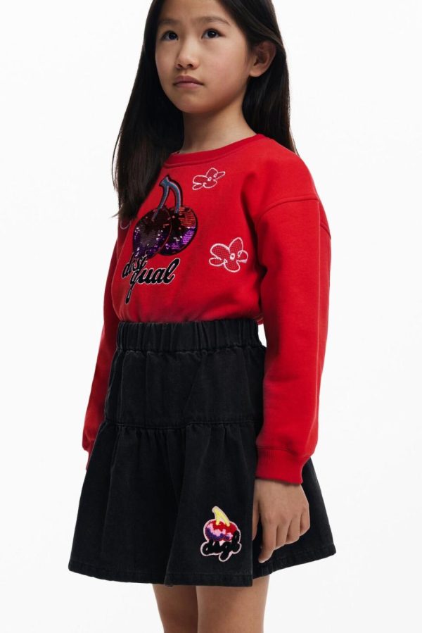 Short skirt in cotton fabric, with horizontal panels, elastic waistband, faded effect, and small cherry embroidery.