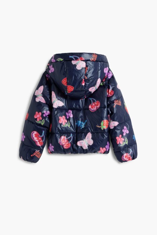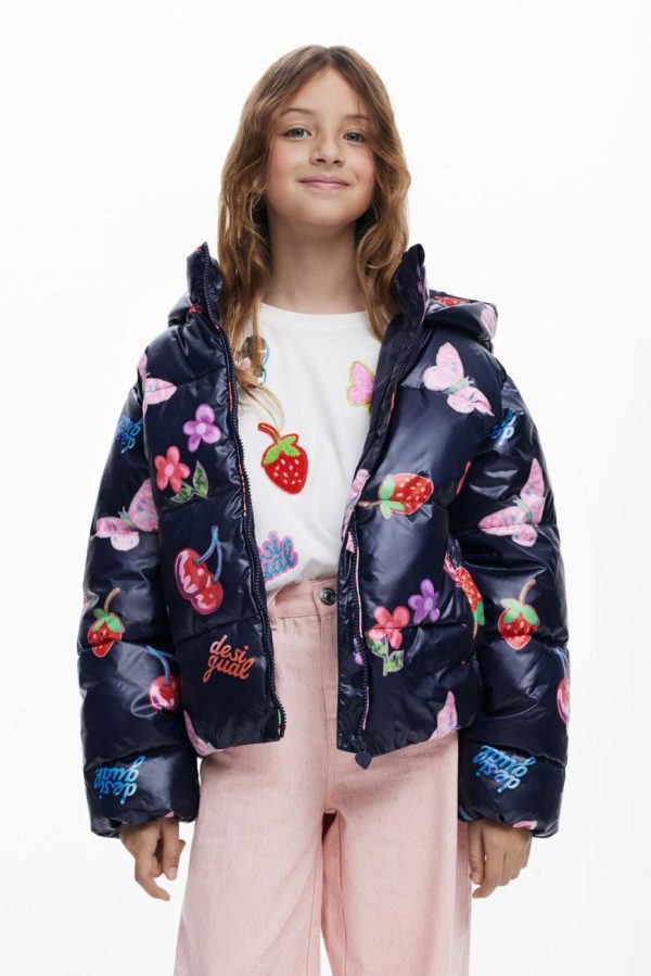 Short padded jacket with long sleeves, hood, collage-type print of various shapes, and metallic effect.