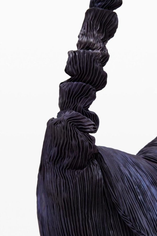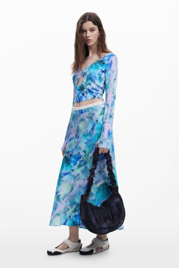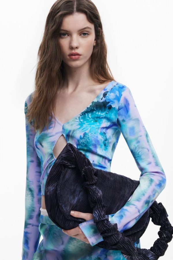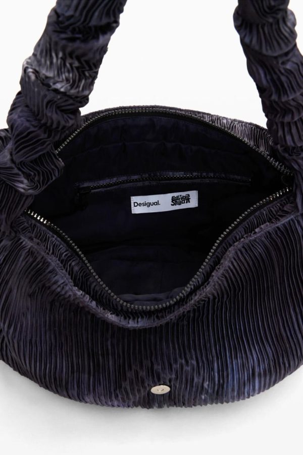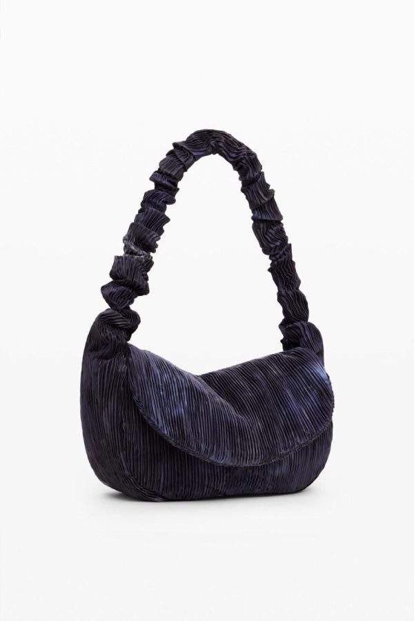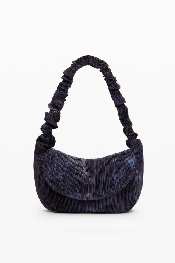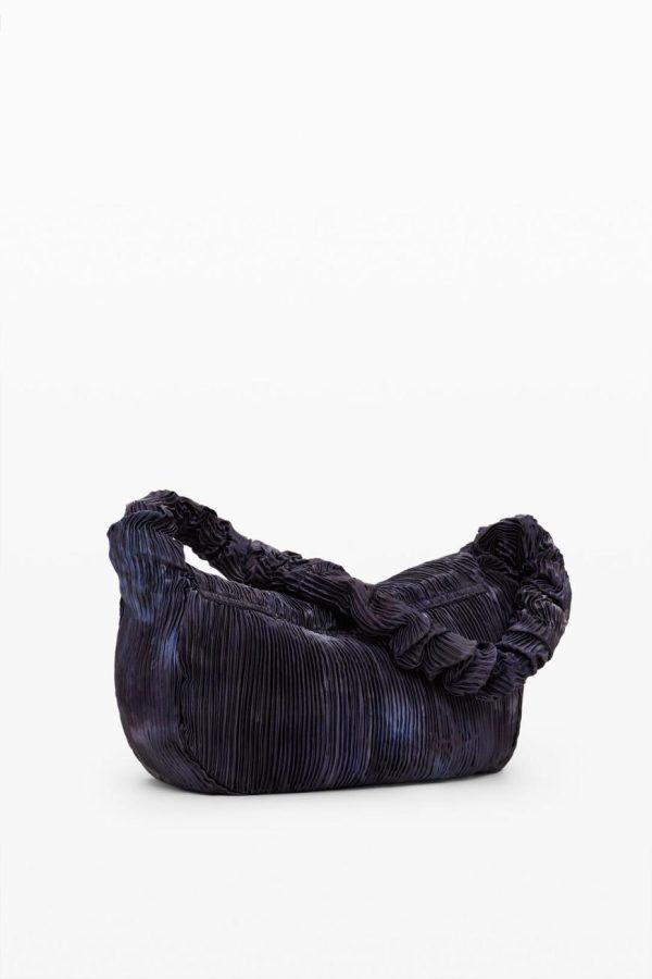 Crossbody style bag with pleated fabric, magnetic flap, Closure: zipper, and blurred floral print.