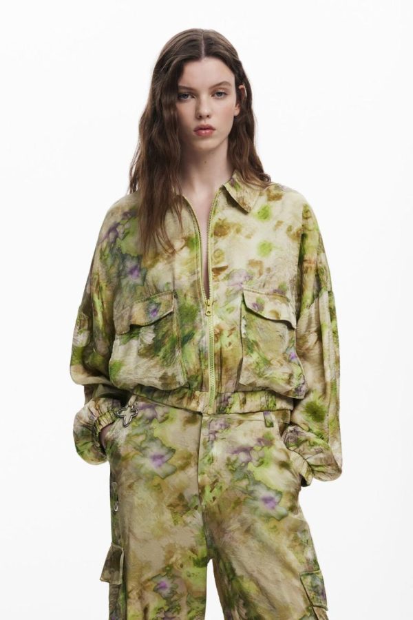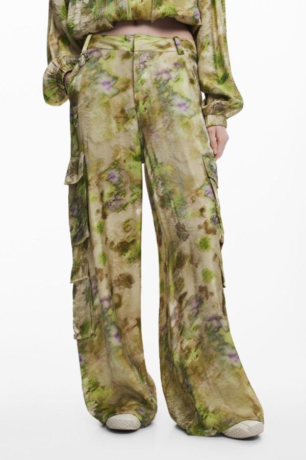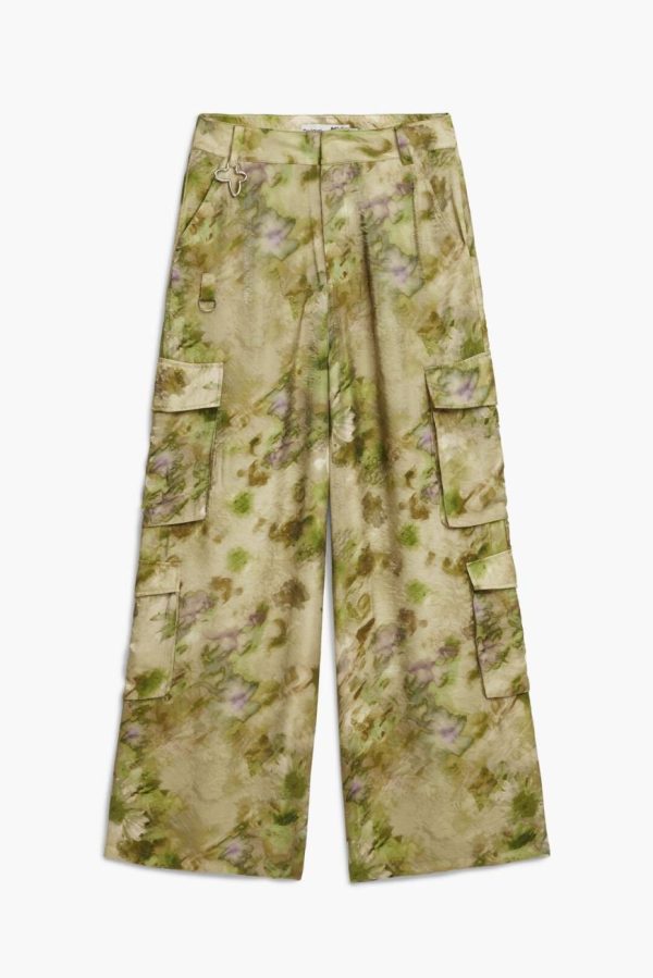 Long cargo pants with a satin finish, multiple pockets, and a detachable keychain designed by Collina Strada.