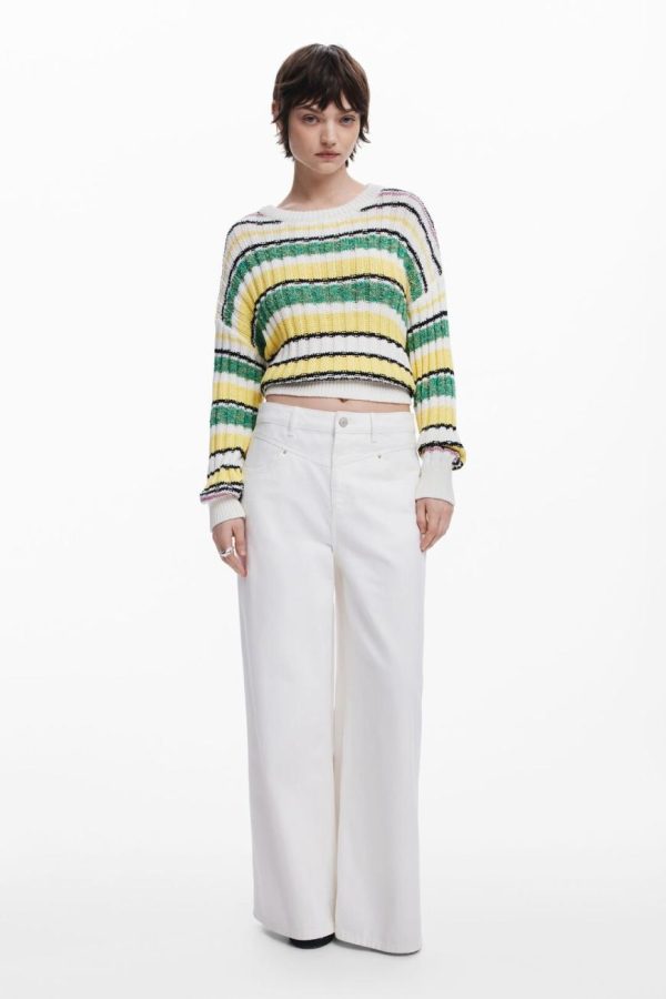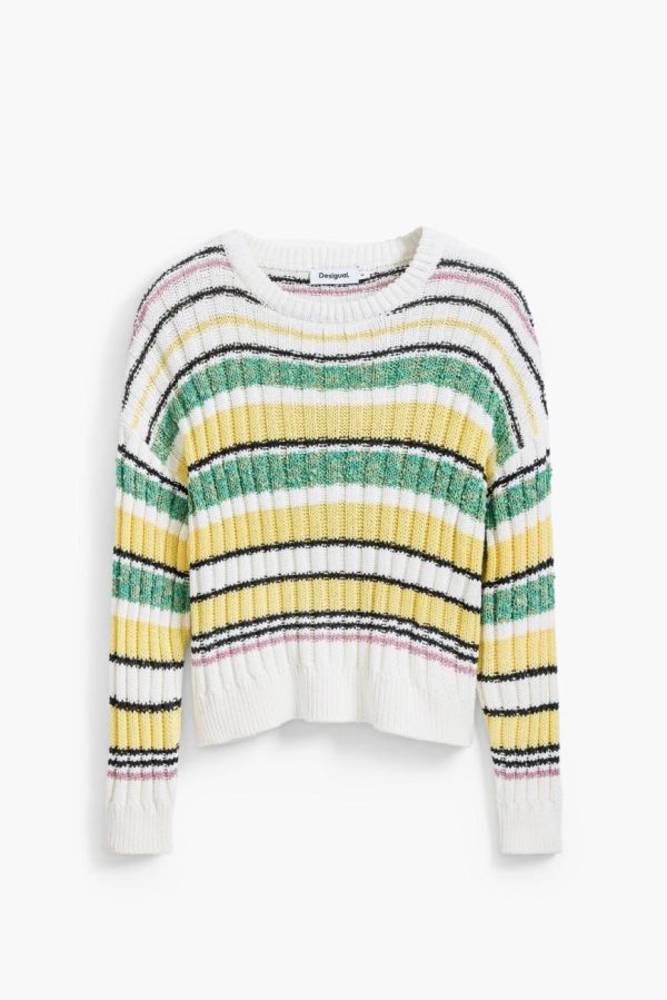 Long-sleeve knit sweater with a round neck and a design of stripes in different colors and thicknesses.