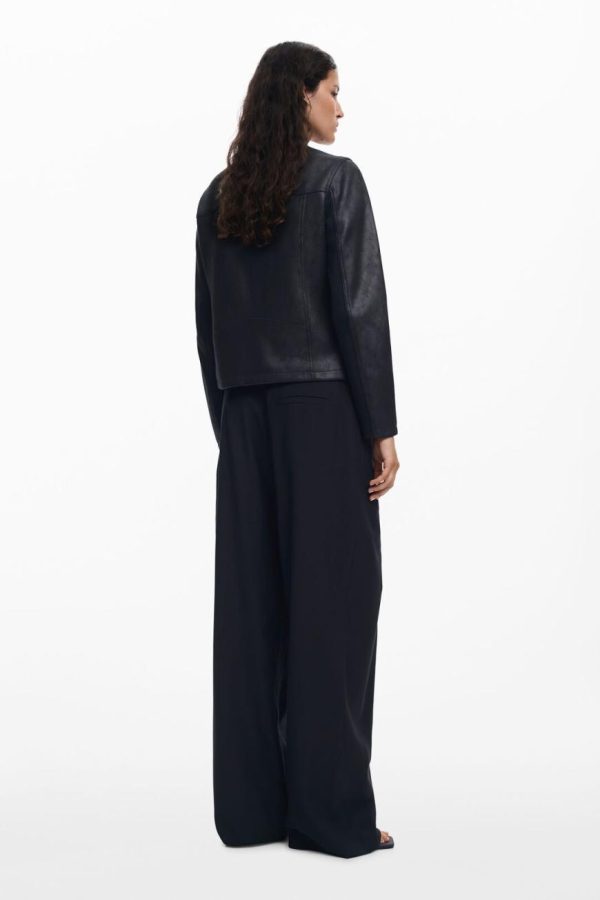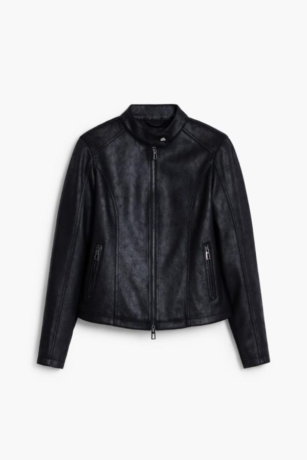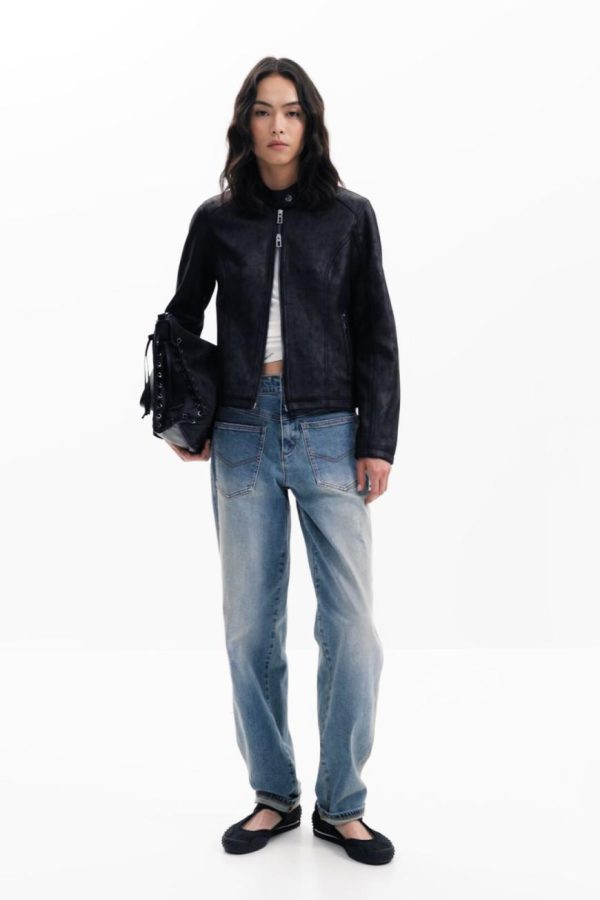 Short jacket in faux leather, zipper closure, mao collar, front pockets, and knitted fabric inside the sleeves.