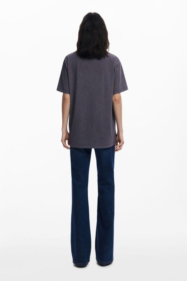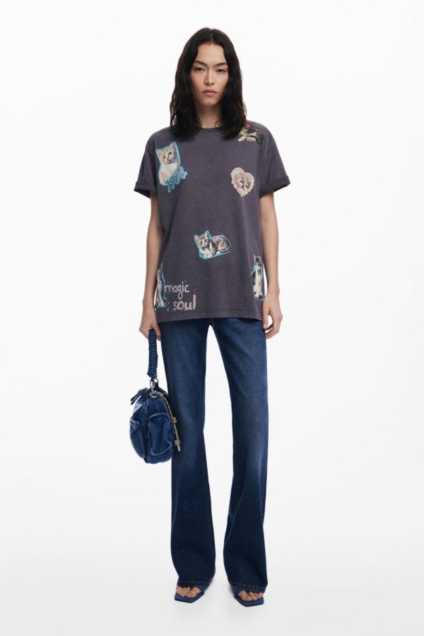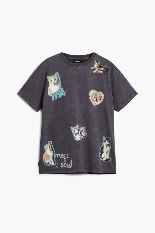 Cotton T-shirt, short-sleeved and round neck, with cat print and message on the front.