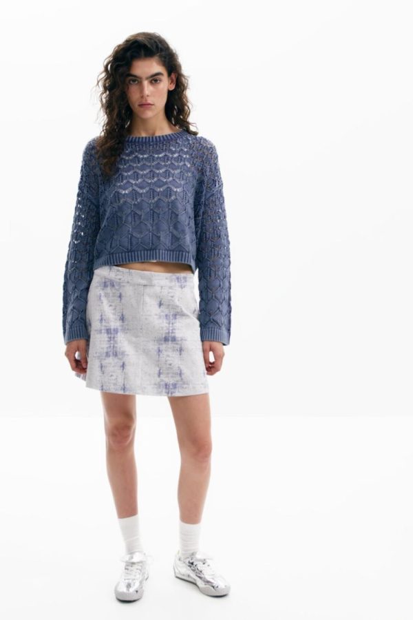 Short sweater in openwork fabric creating transparencies with a round neck and long sleeves in a solid color.
