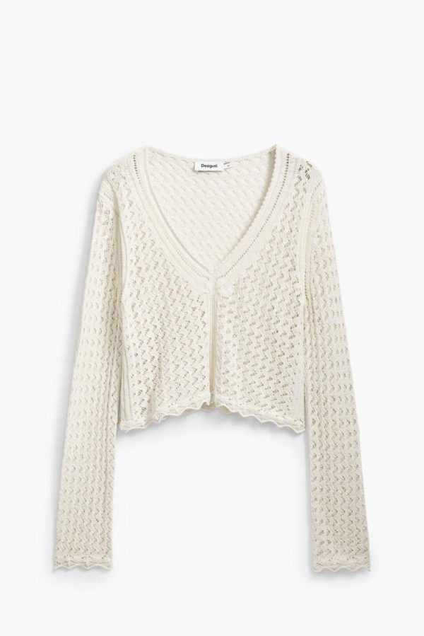 V-neck sweater with long sleeves, cropped cut, and zigzag eyelets in solid color.