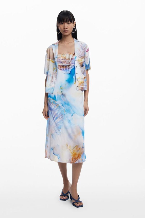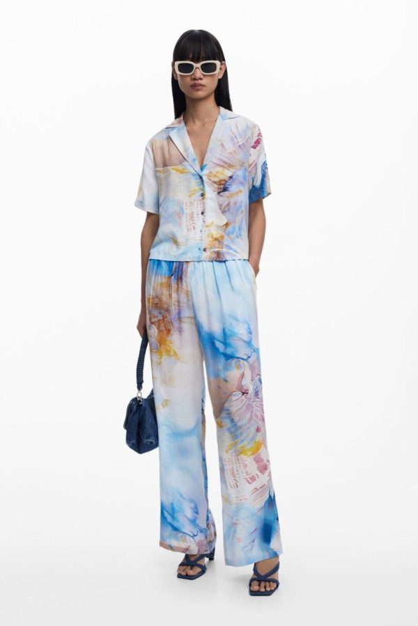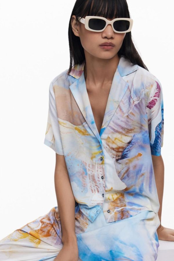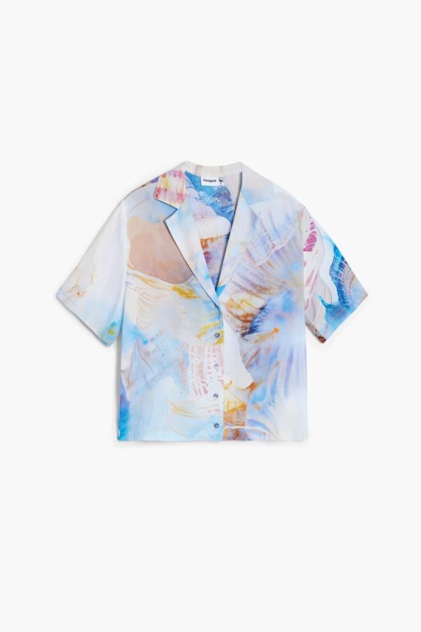 Short-sleeve cropped shirt with front buttons and seashell print.