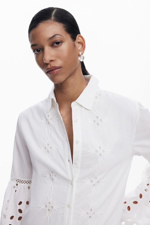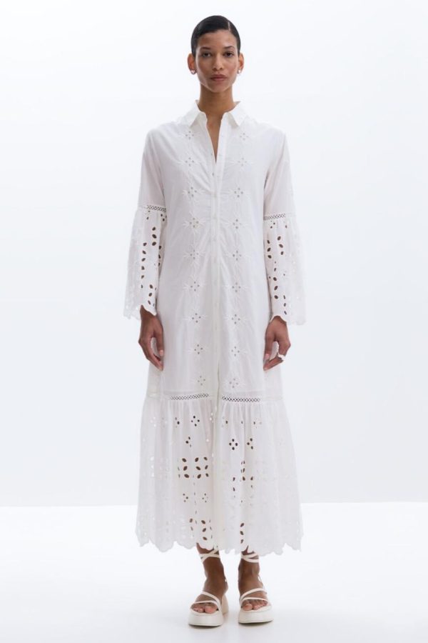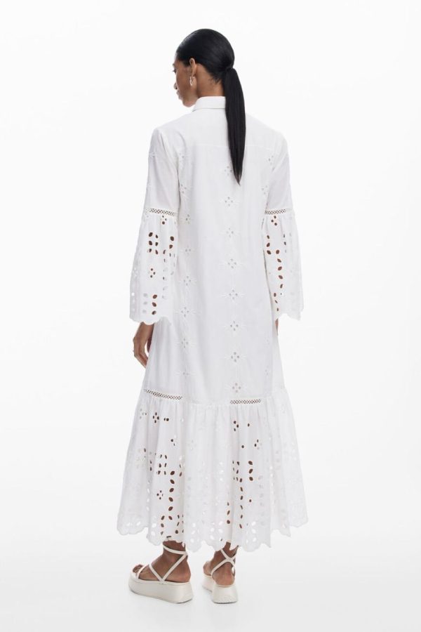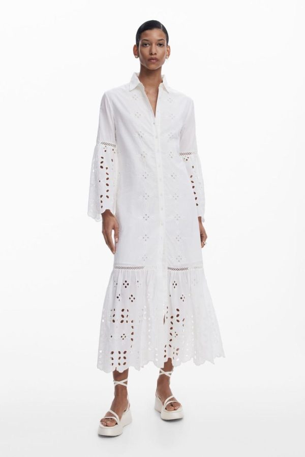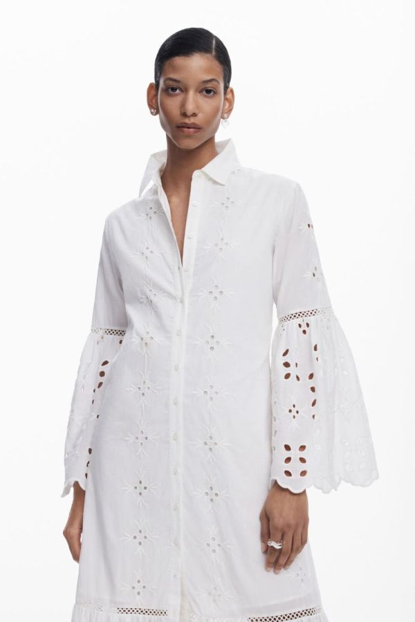 Long cut-out shirt dress with panels and tulip-style flared sleeves in solid color.