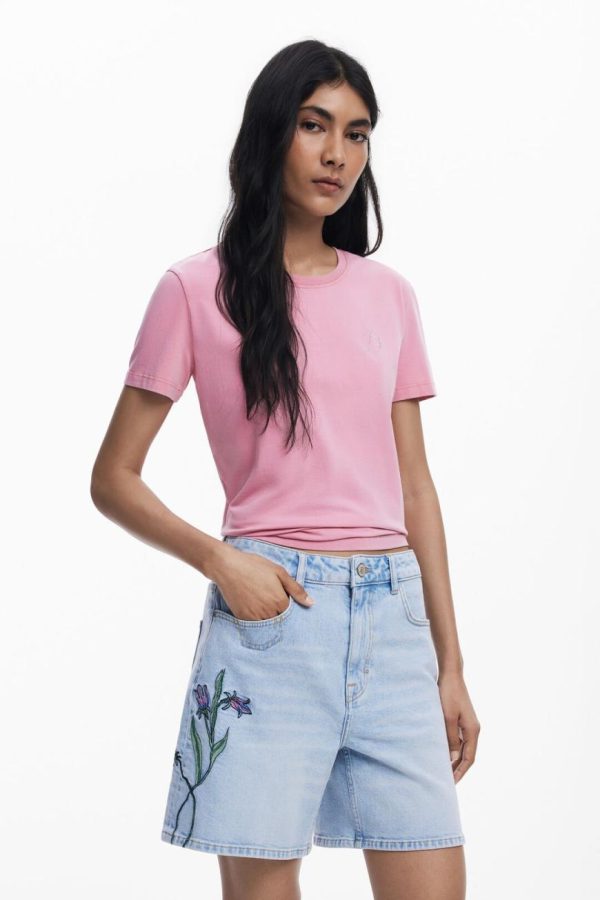 Denim Bermuda shorts with a worn effect and floral embroidery on the front
