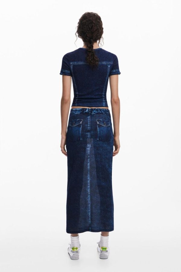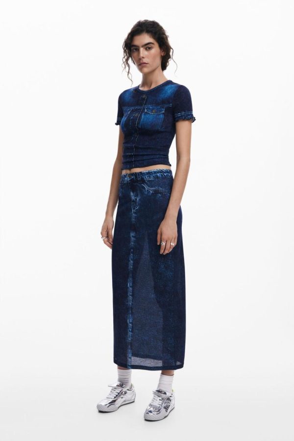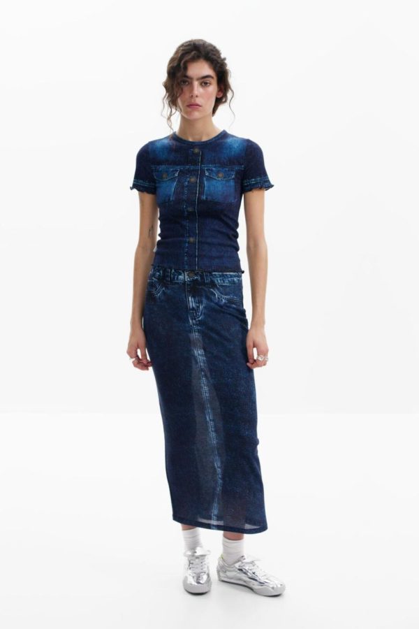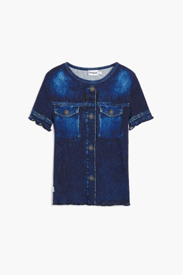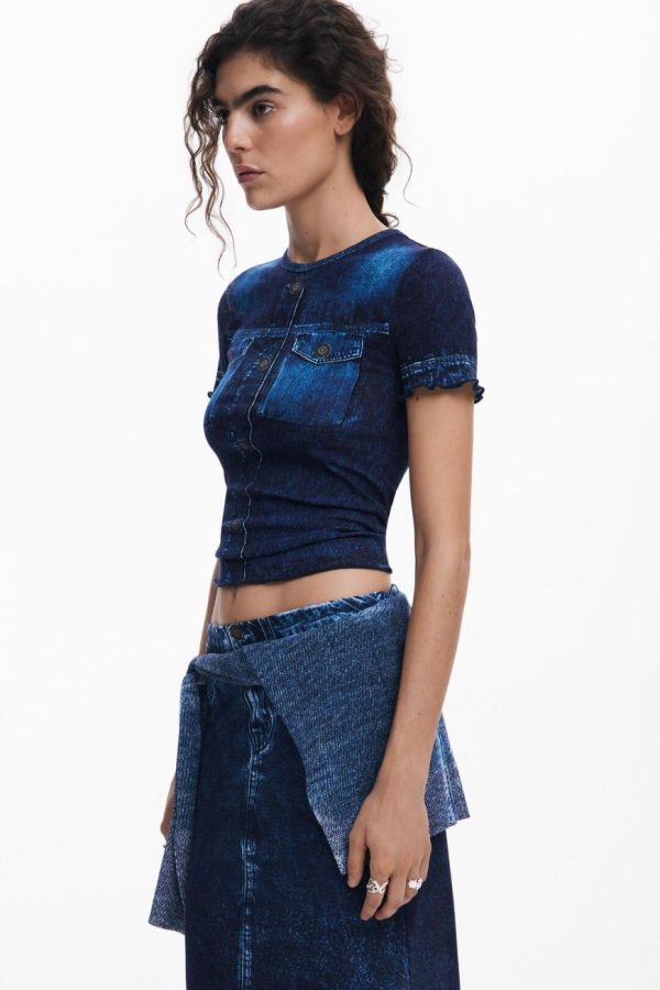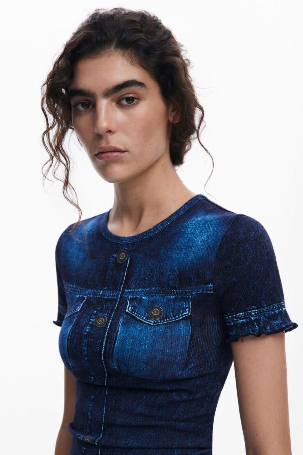 Fitted short-sleeve T-shirt with ribbed finish and round neck, in stretch fabric with worn denim effect print.