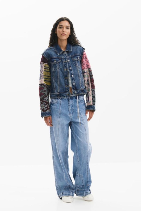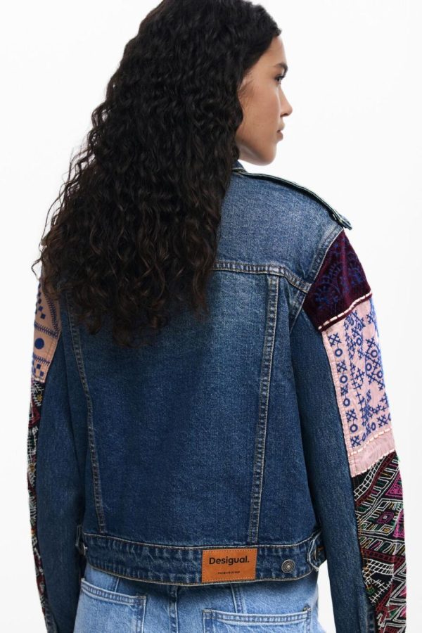 Elevate your casual style with this classic trucker-inspired denim jacket featuring eye-catching patchwork sleeves with ethnic-inspired patterns and convenient front pockets.