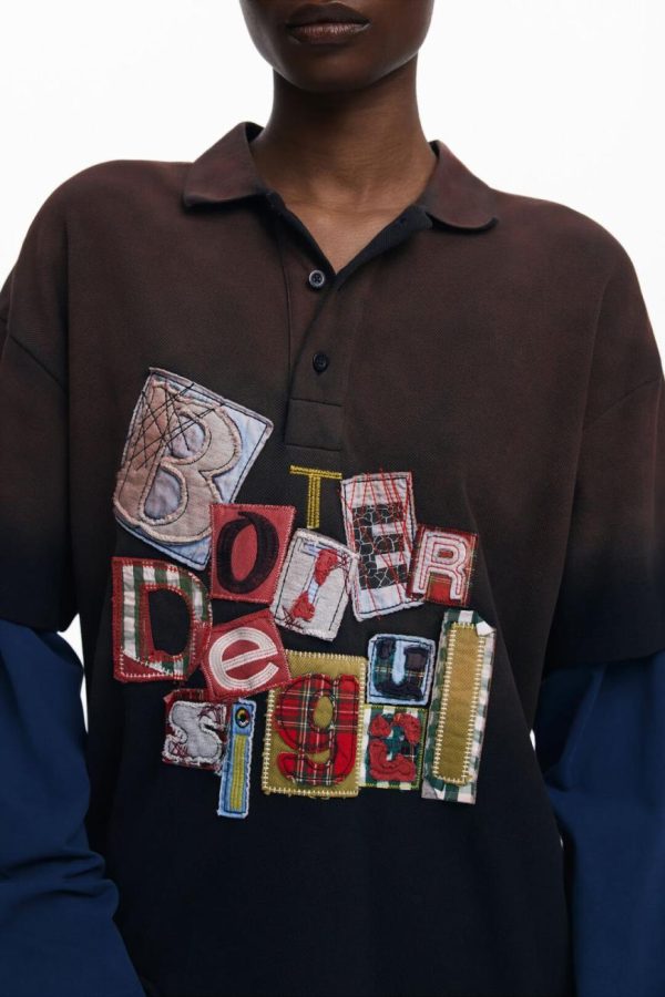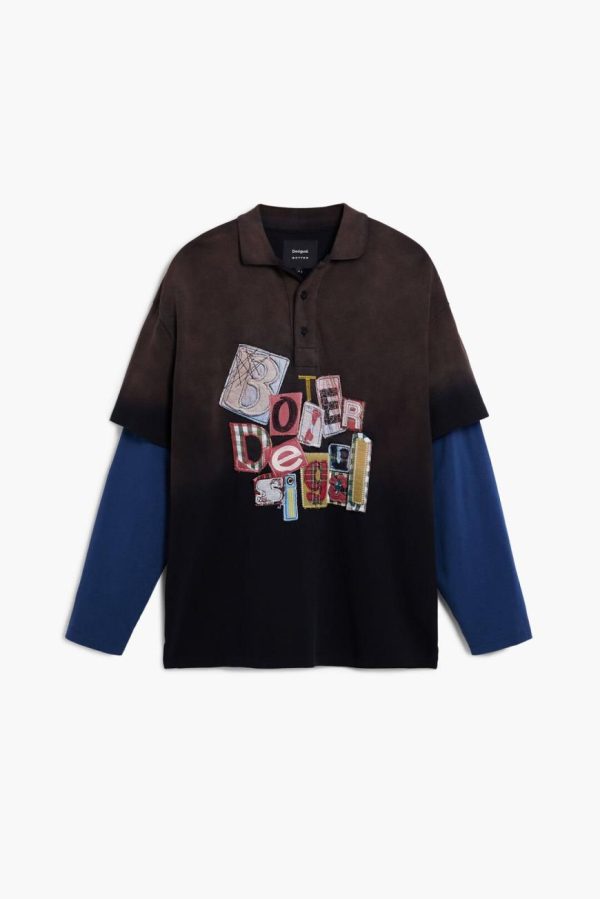 Polo-style T-shirt in piqué fabric, with short and long sleeves layered in one piece, patchwork lettering design, and a gradient-colored background with a sun-aged effect.