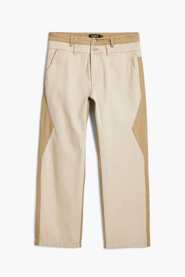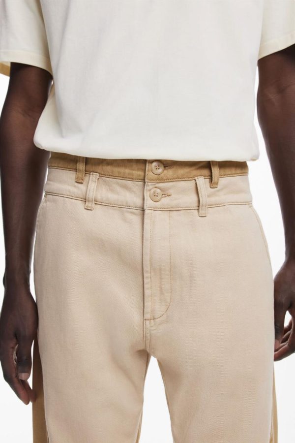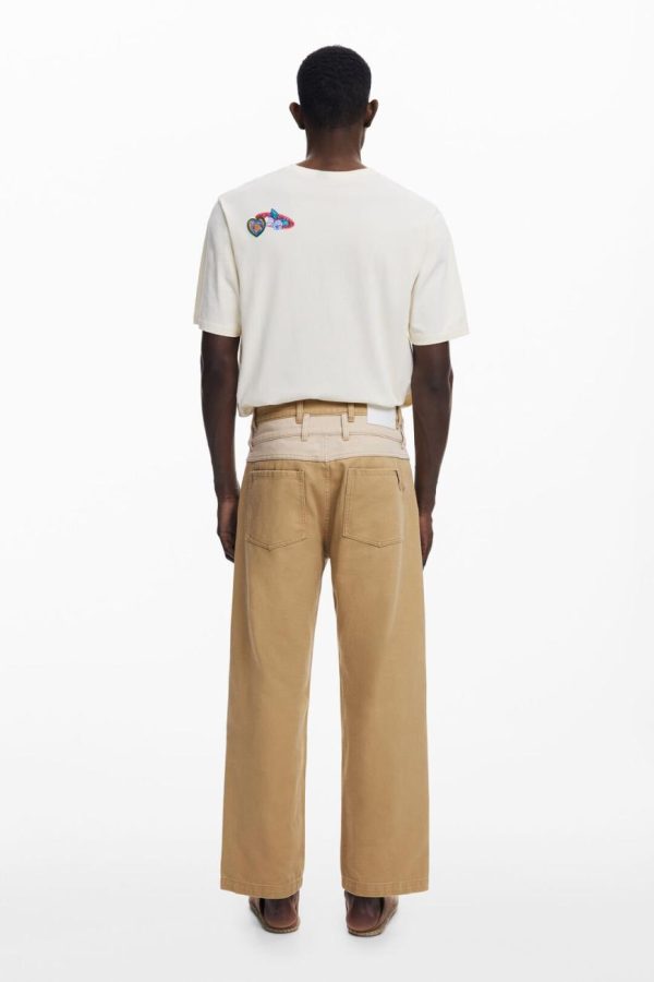 Long denim pants with double waistband in two tones, color contrast, and belt loops at the waist.