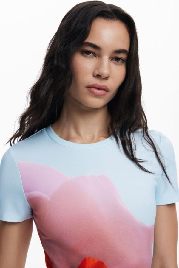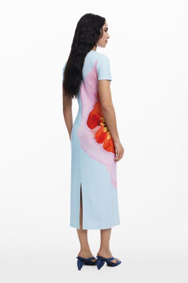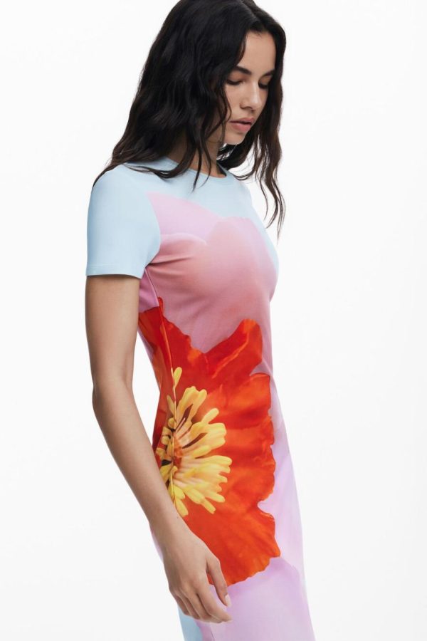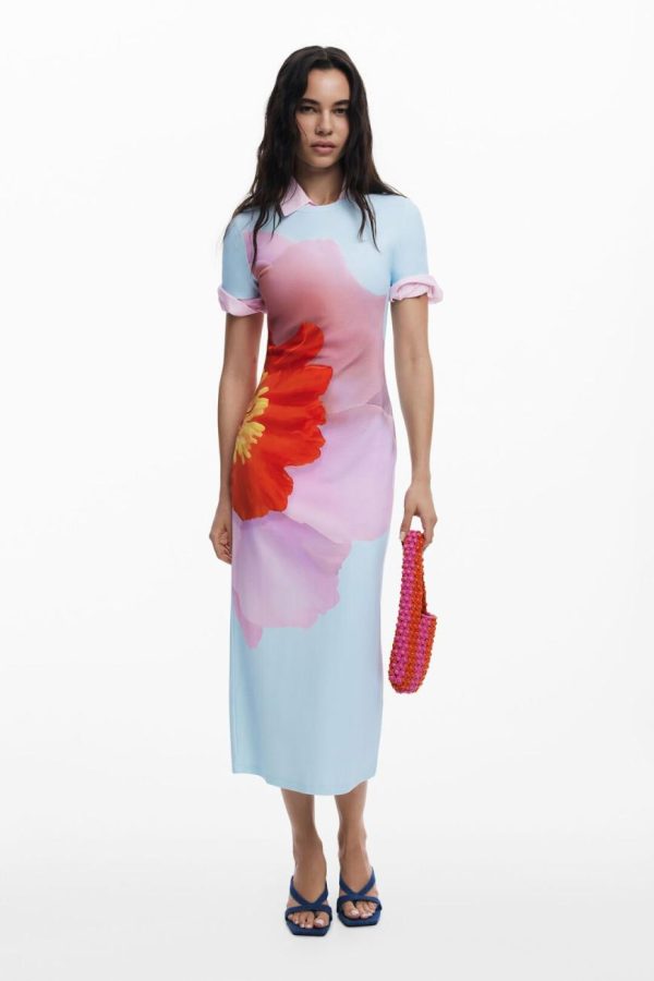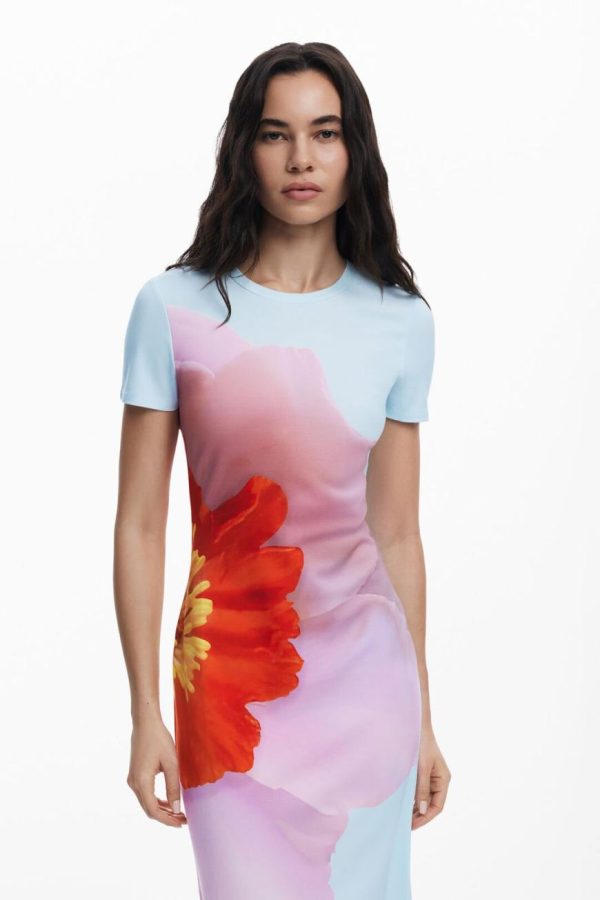 Midi dress with short sleeves and round neck with floral print on a plain background designed by Monsieur Christian Lacroix.