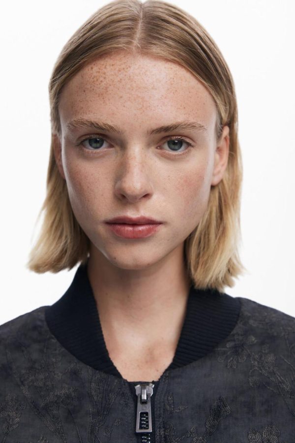 Short bomber-style jacket with front pockets, knitted collar, and elastic waistband with oriental-inspired embroidery.
