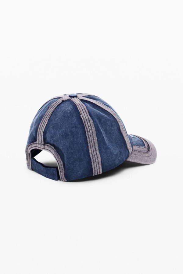 Embroidered cap with lettering in a combination of twill and cotton fabrics with an aged effect and adjustable velcro closure at the back