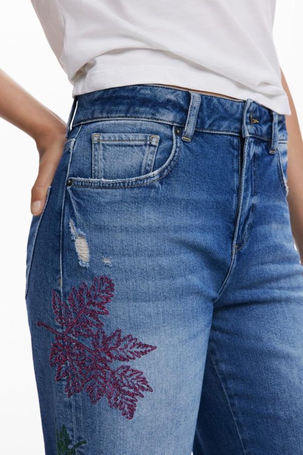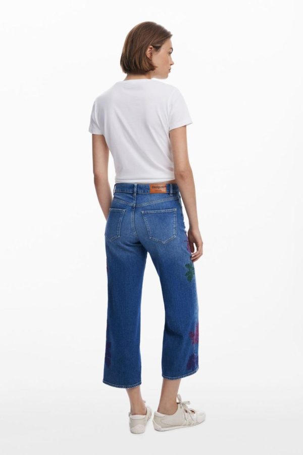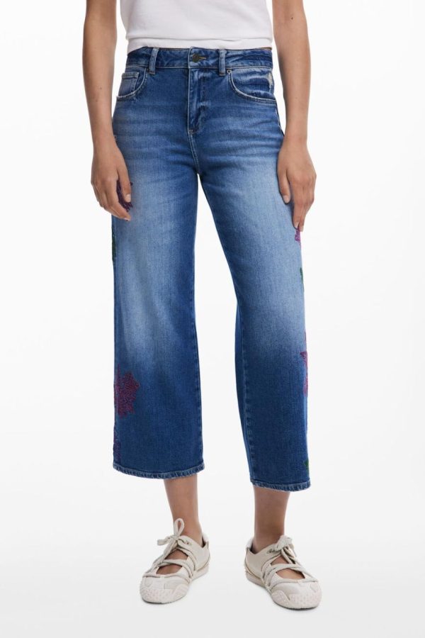 Culotte-cut jeans with a washed effect and botanical motif embroidery on both legs.