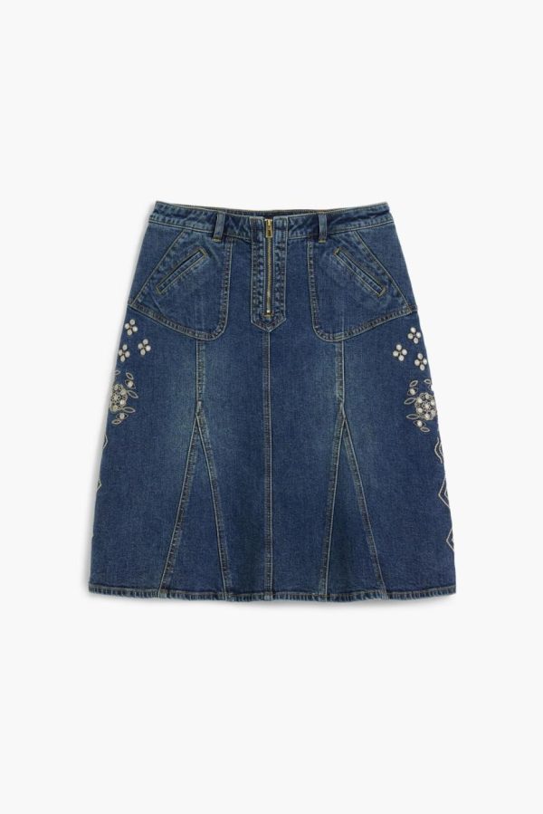 Knee-length skirt with godets in denim and embroidered details.