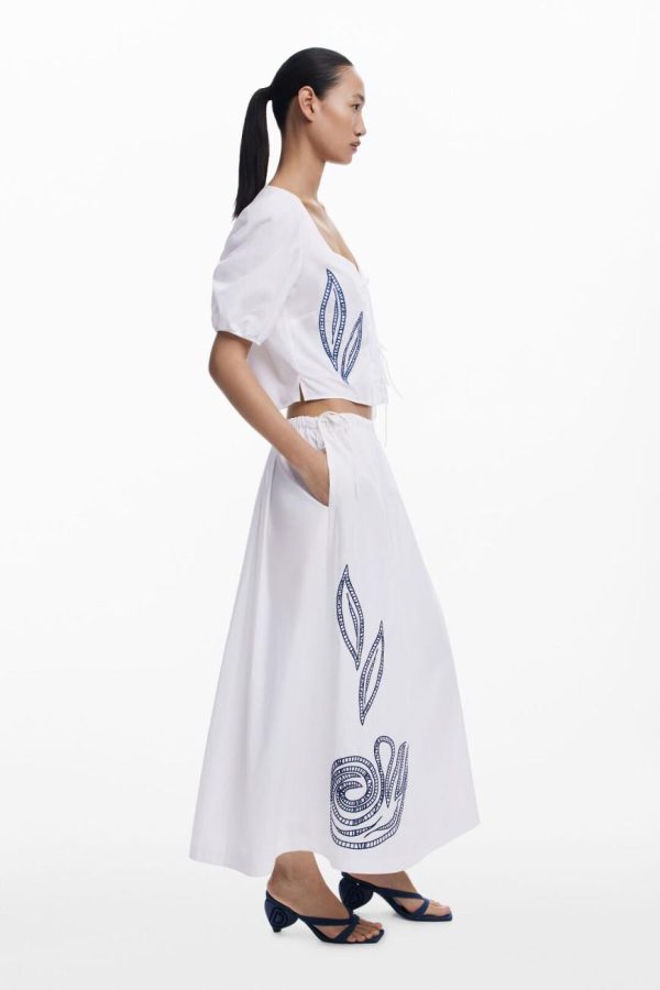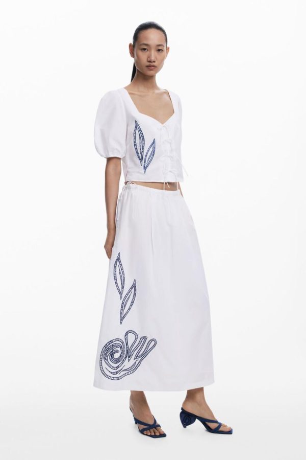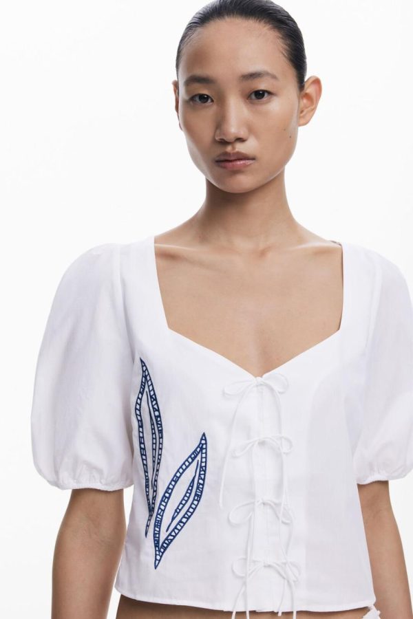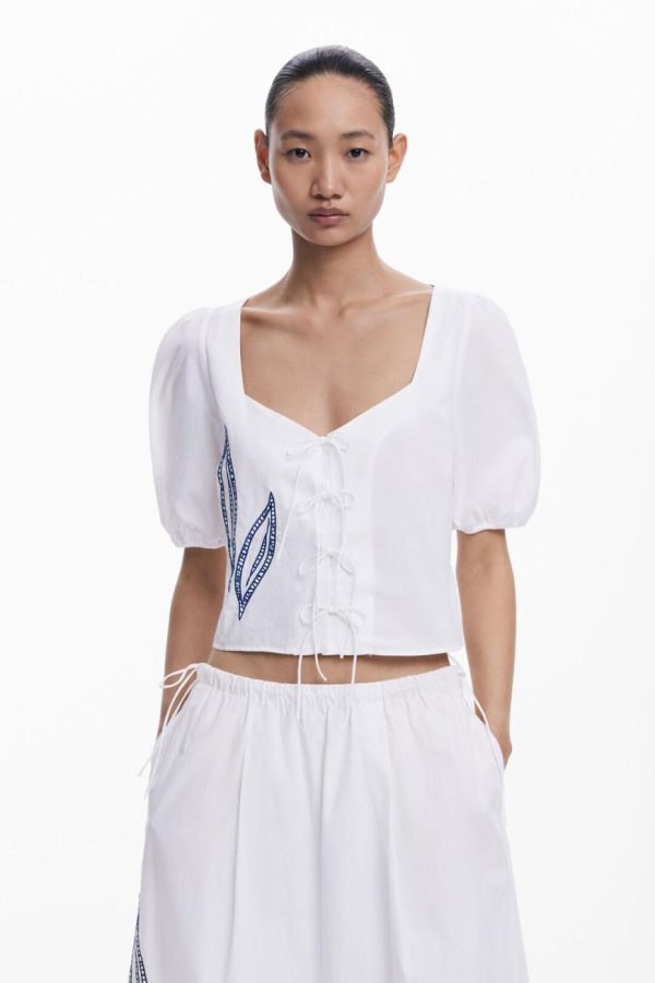 Short-sleeve blouse with puffed style, in solid color, featuring embroidered leaf details with contrasting thread and ties at the front.