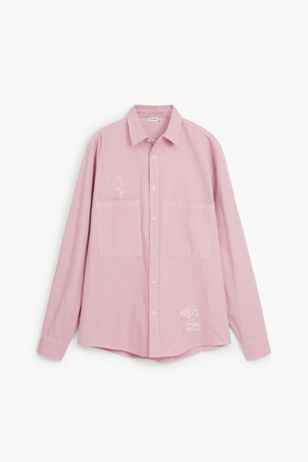 Long-sleeve shirt with small contrasting embroideries, button closure, and front pocket.
