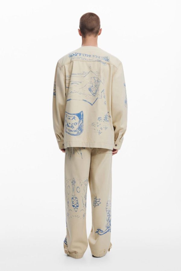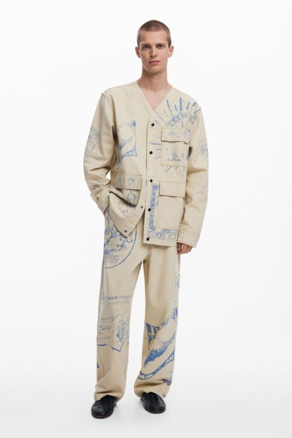 Long-sleeve jacket with V-neck, button closure, and various ethnic prints