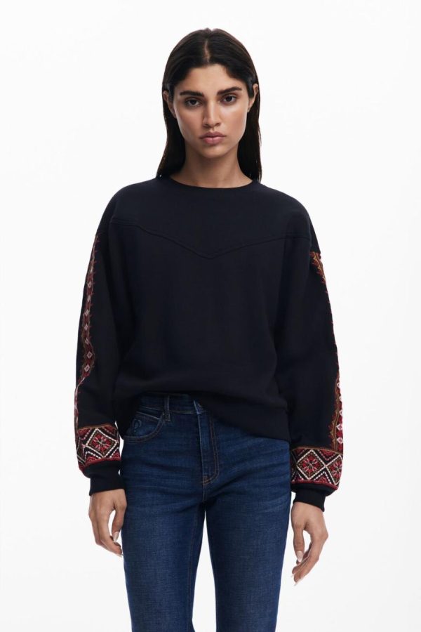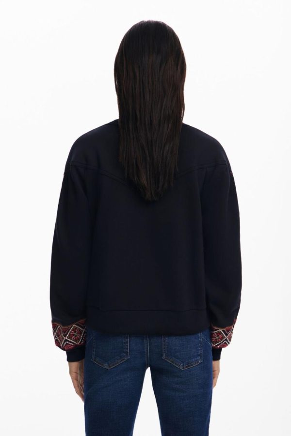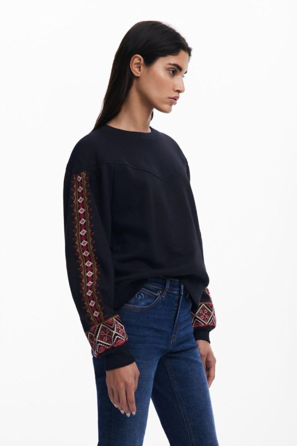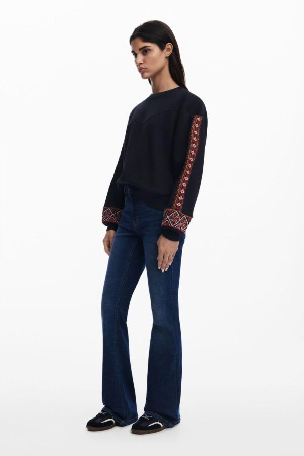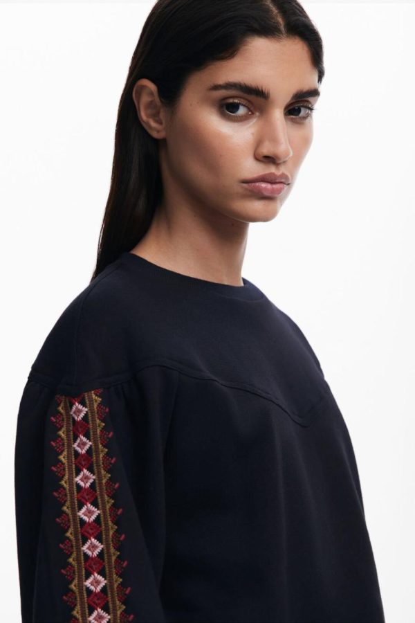 Crew neck sweatshirt with elastic hem, in solid color and embroidered stripes with ethnic details.