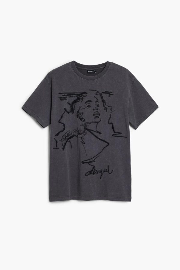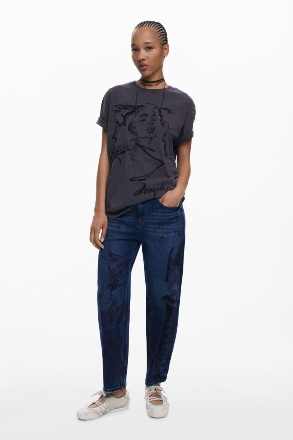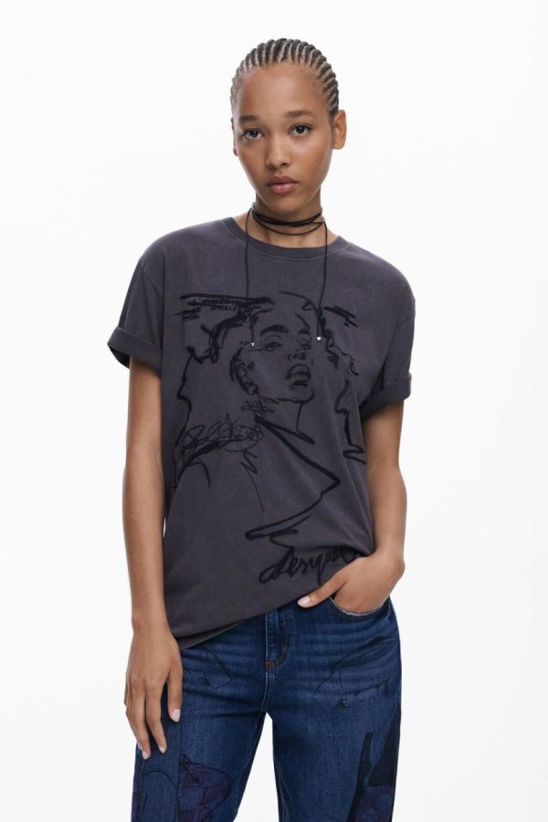 Short-sleeve t-shirt with a round neck, print, and 3D details of embroidered cord featuring a logo and a female face.