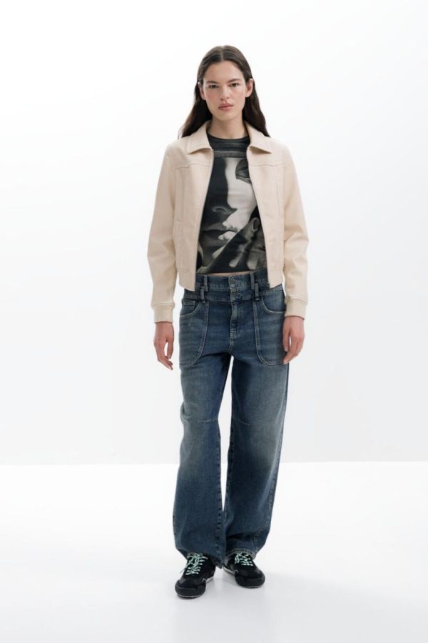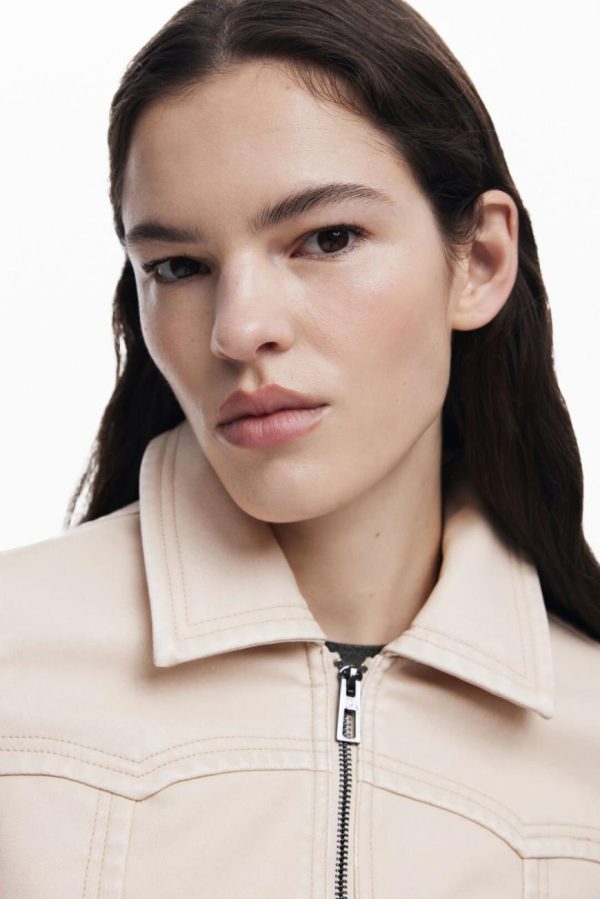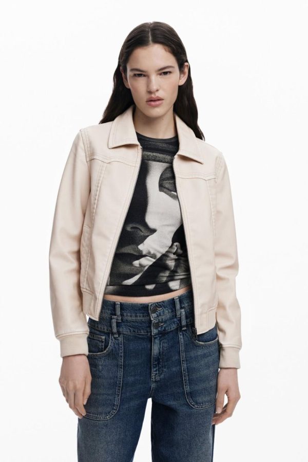 Biker-style jacket with faux leather fabric, lapel collar, zipper closure, front pockets, and elastic waistband.