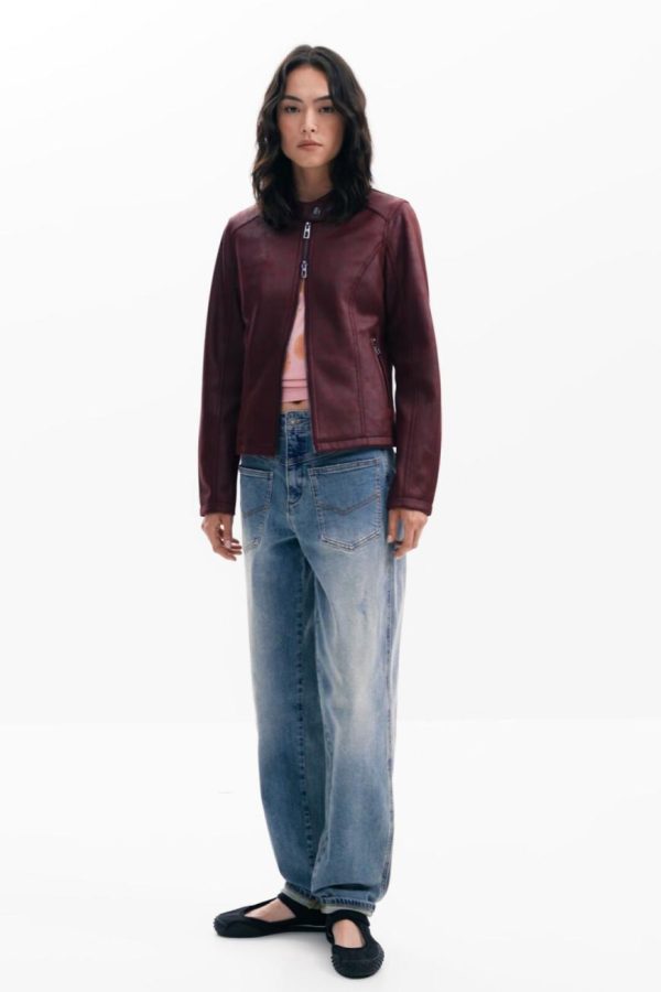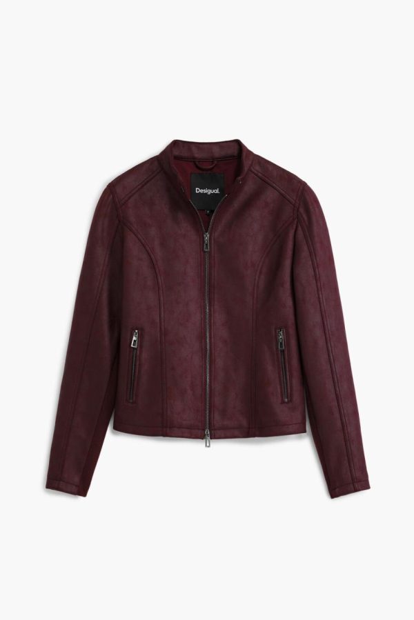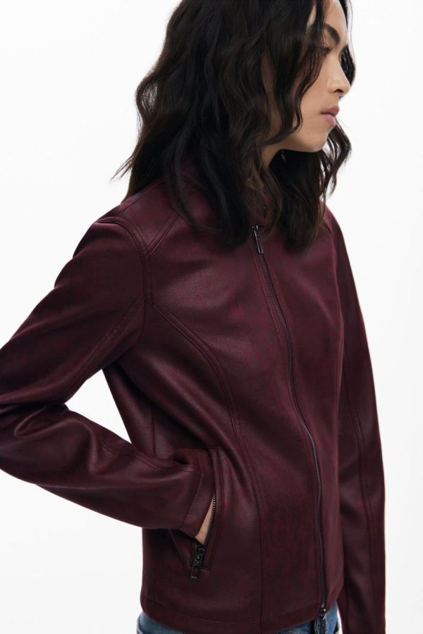 Elevate your style with this chic cropped faux leather jacket featuring a sleek zipper closure, contemporary mao collar design, practical front pockets, and comfortable knitted fabric lining inside the sleeves for added comfort.