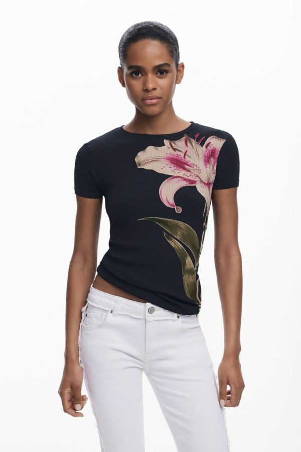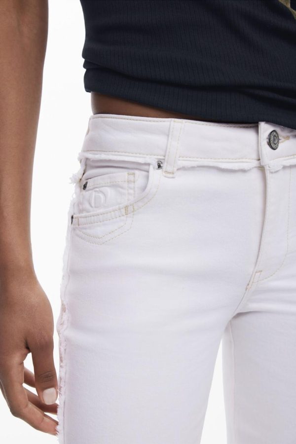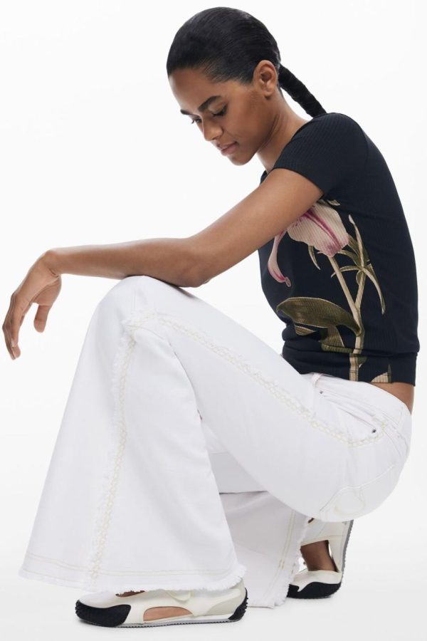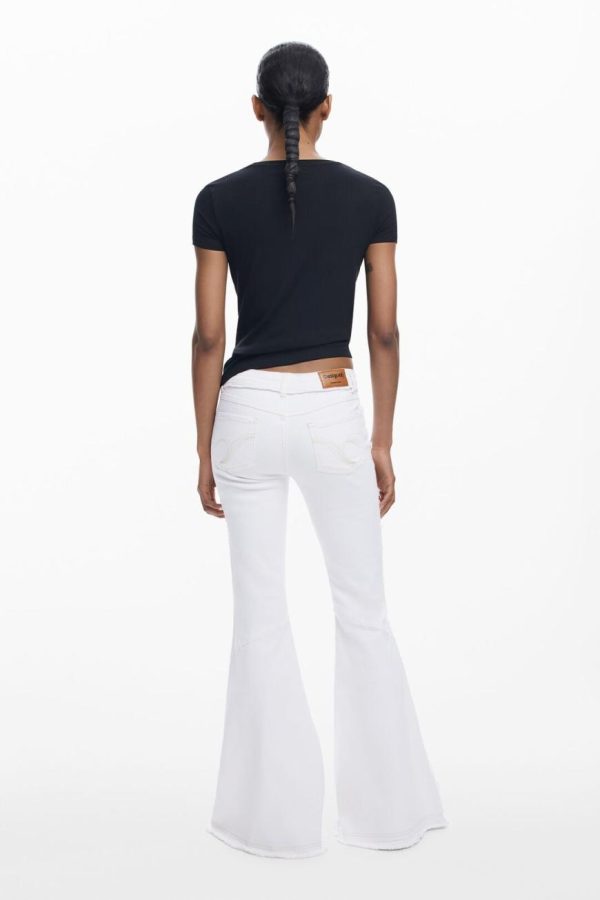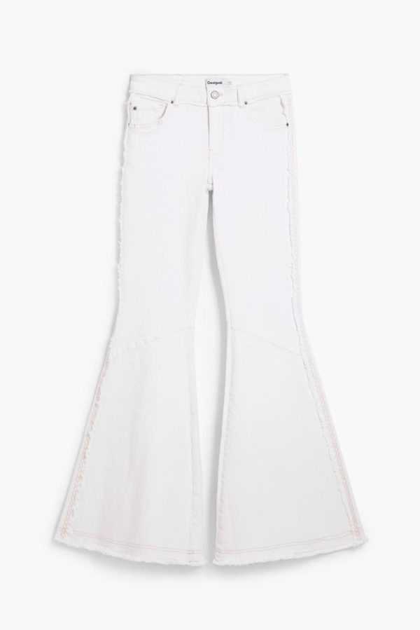 Long flared jeans with embroidered contrast-colored stitching details on the sides