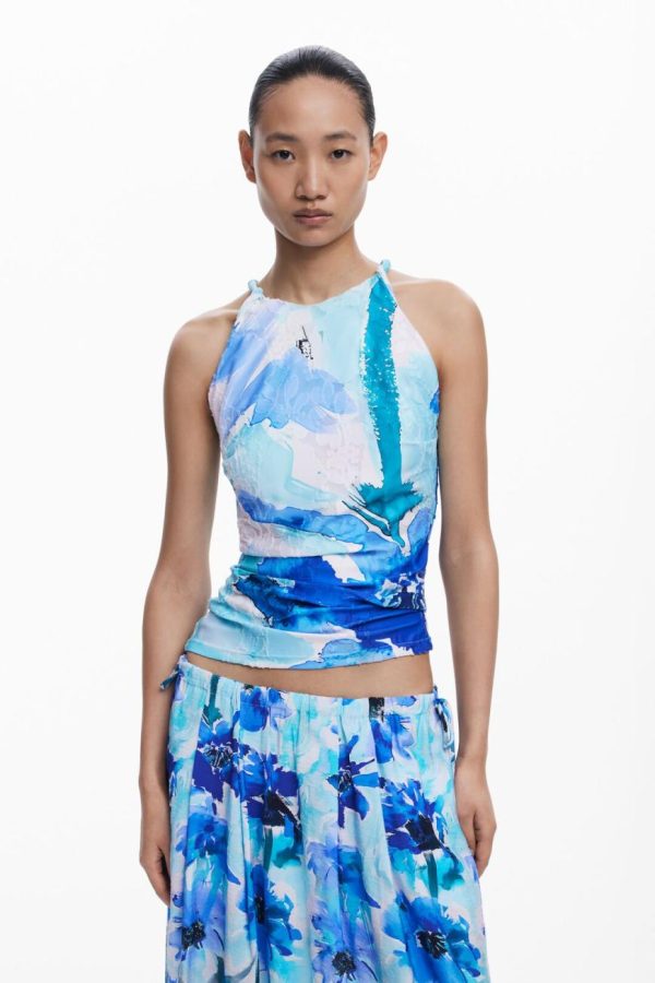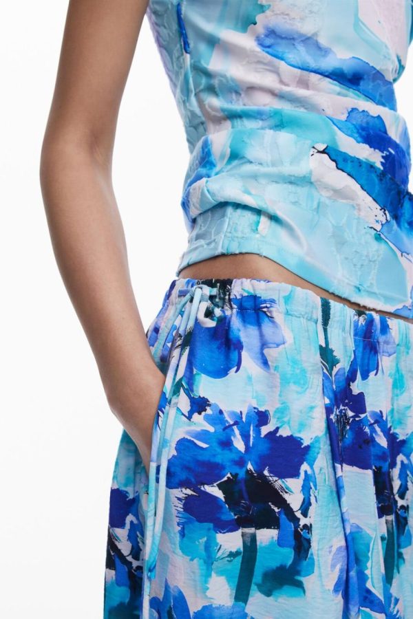 Midi skirt with a soft touch, A-line cut, elastic waistband, and floral print in blue tones.