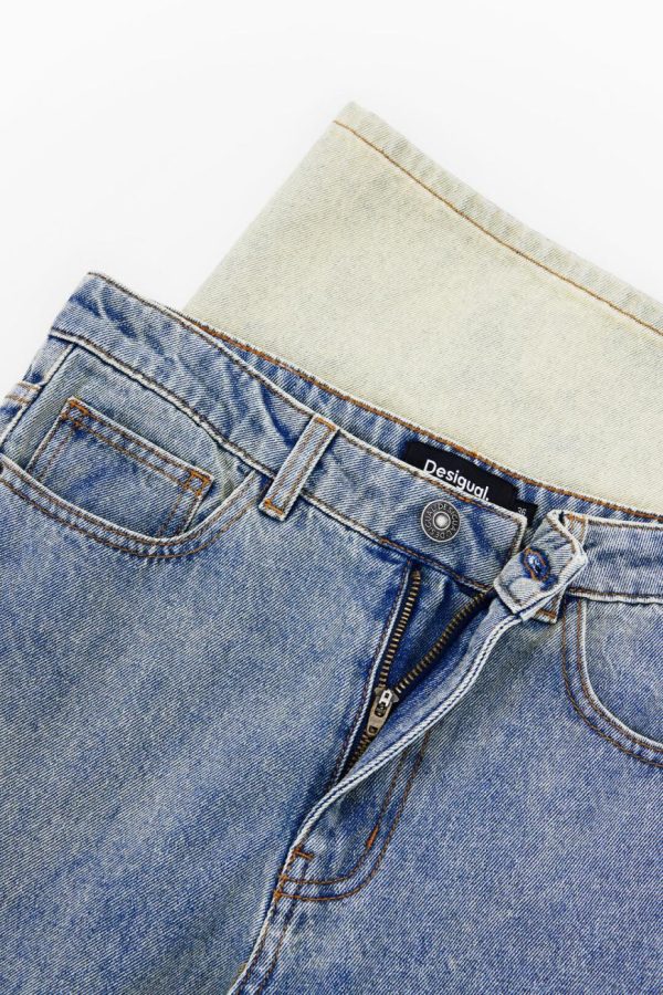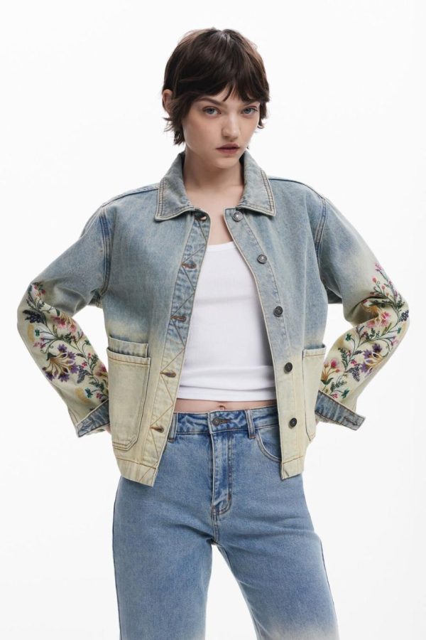 Culotte-cut jeans with a faded worn effect and embroidered flowers on both legs.