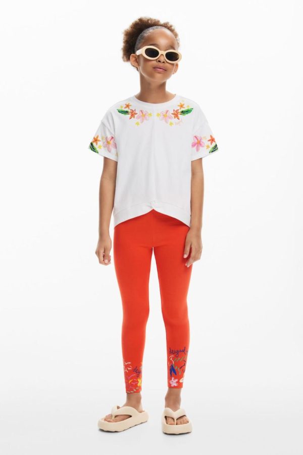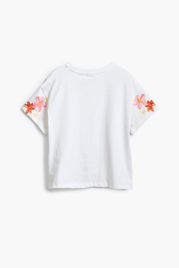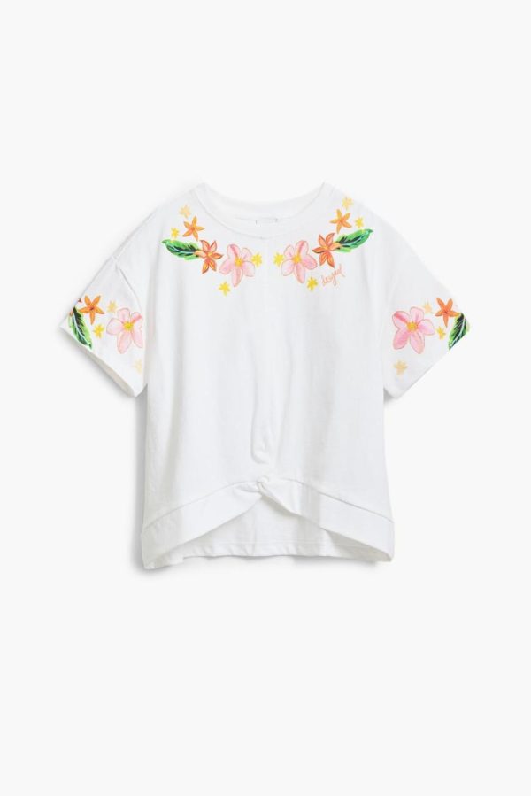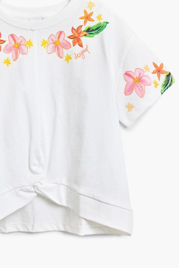 Stylish short-sleeve T-shirt featuring a playful knot detail and vibrant floral print design