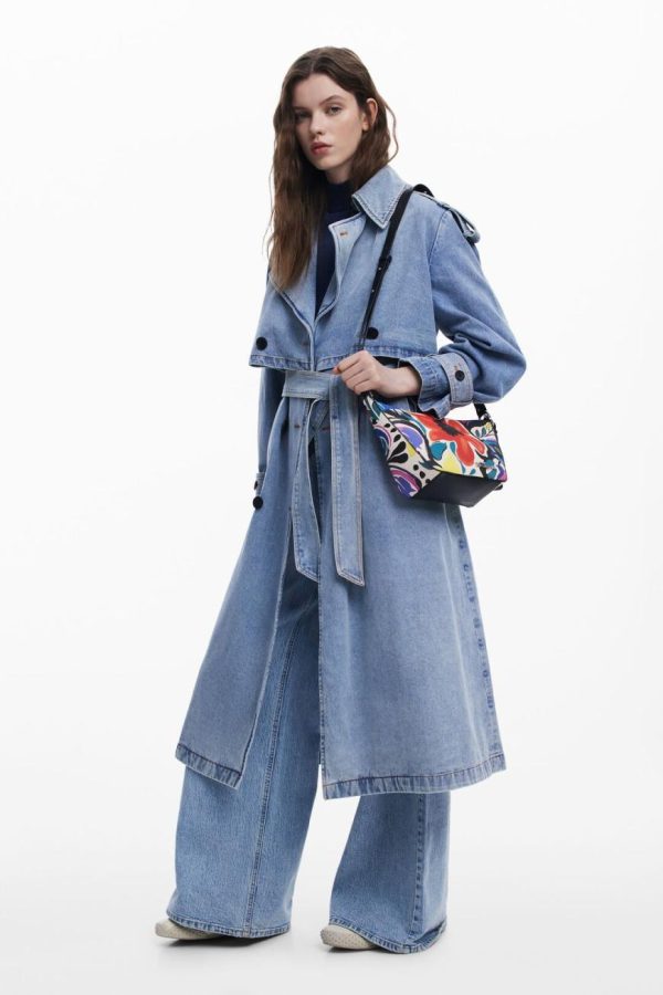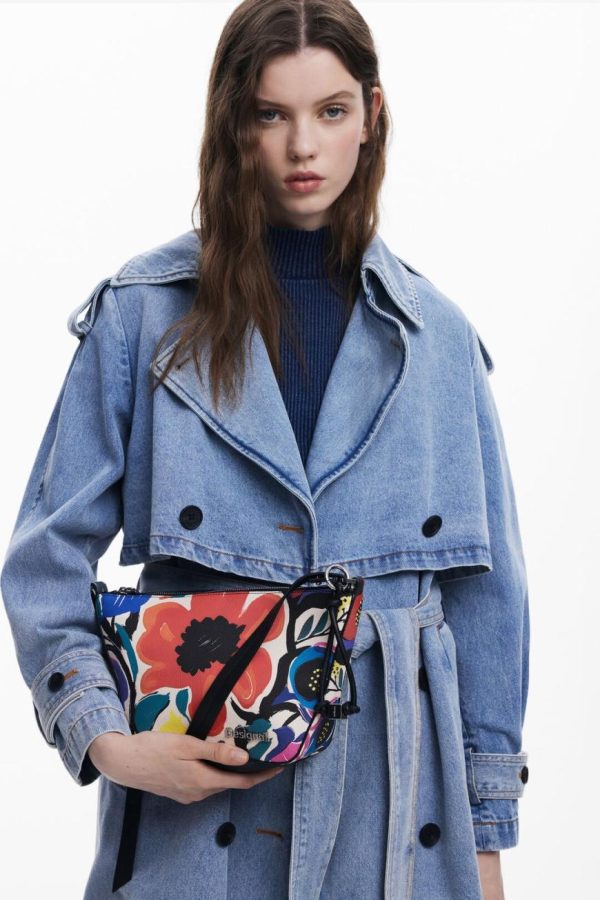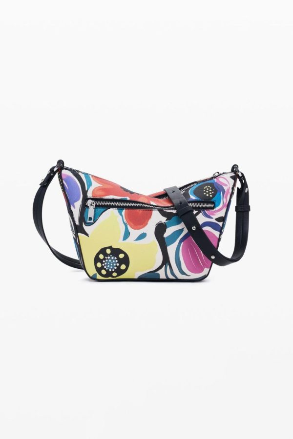 Chic crossbody bag featuring a vibrant floral print design, convenient rear exterior pocket for quick access, and versatile interchangeable handles for multiple carrying options.