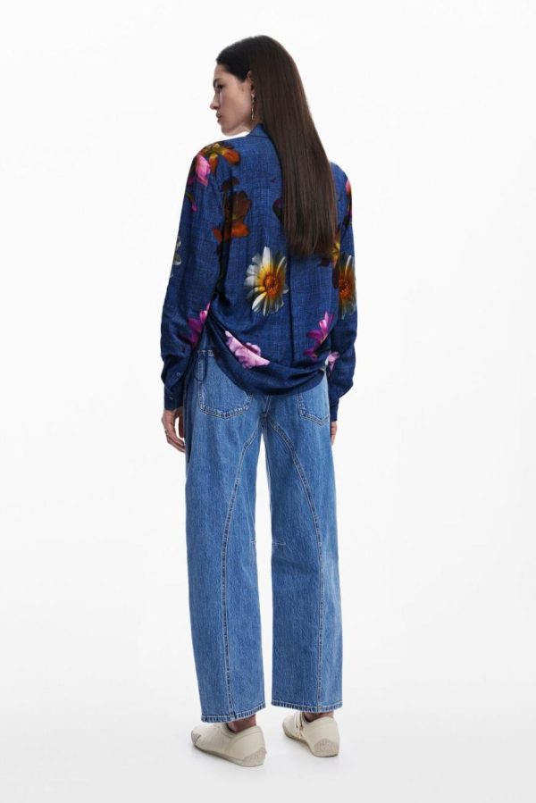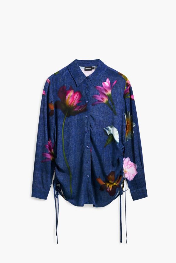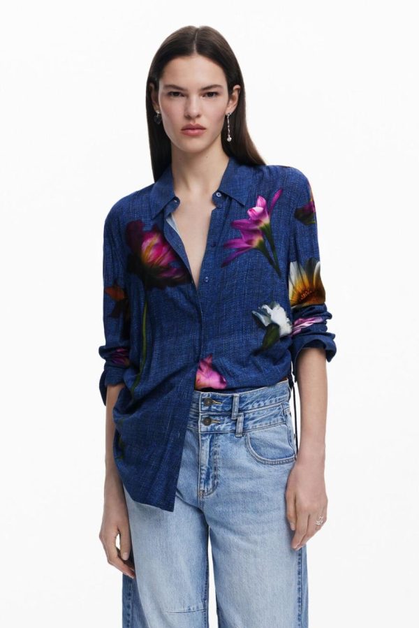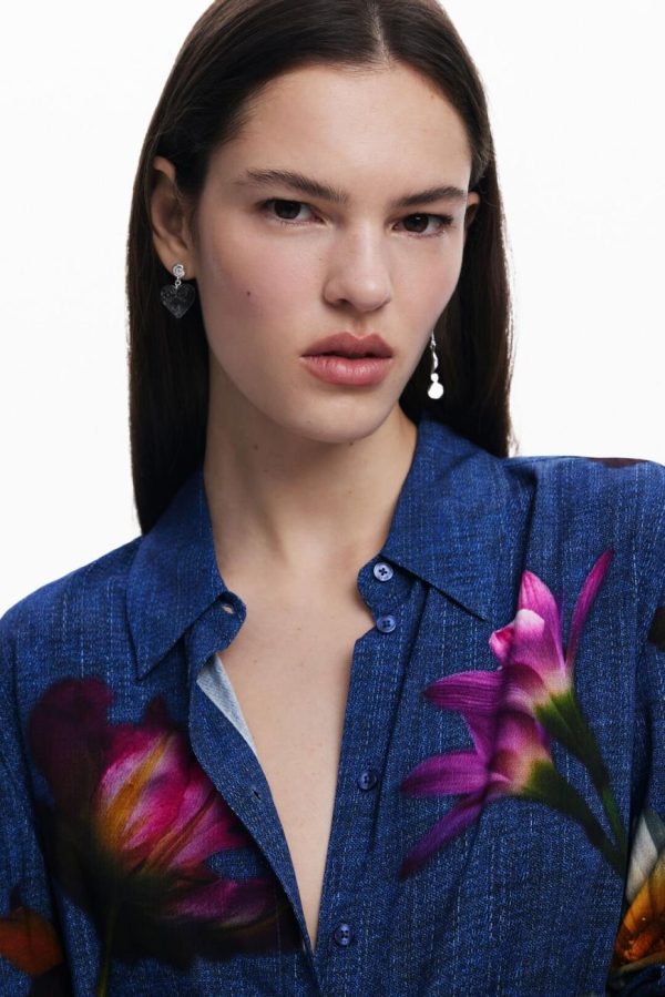 Solid color long-sleeve shirt with colorful flower design and shirt collar.