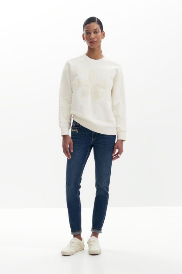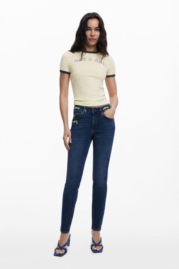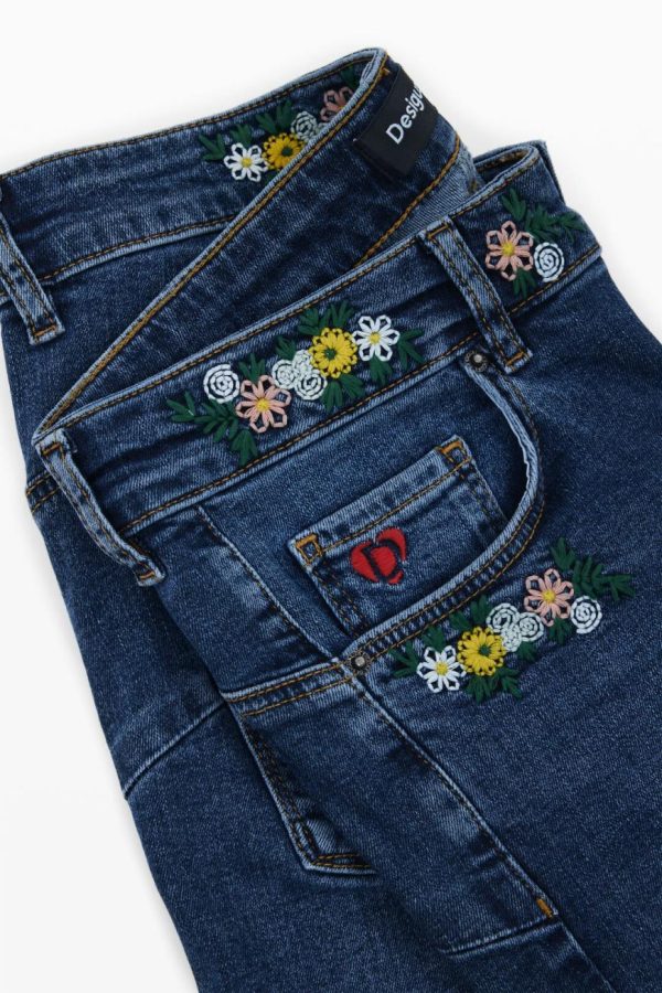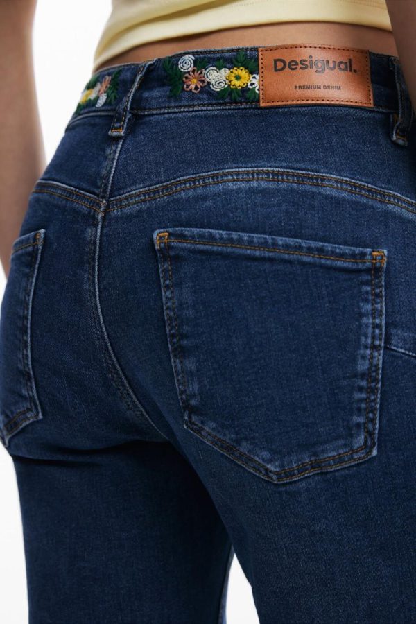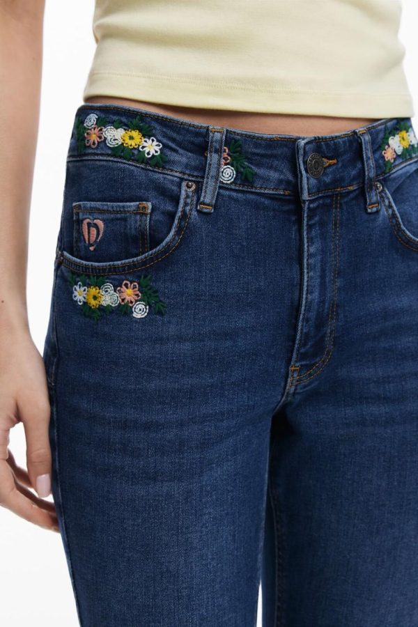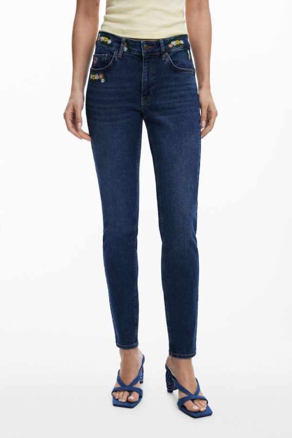 Skinny fit jeans, tight, with embroidered flower details at the waist.
