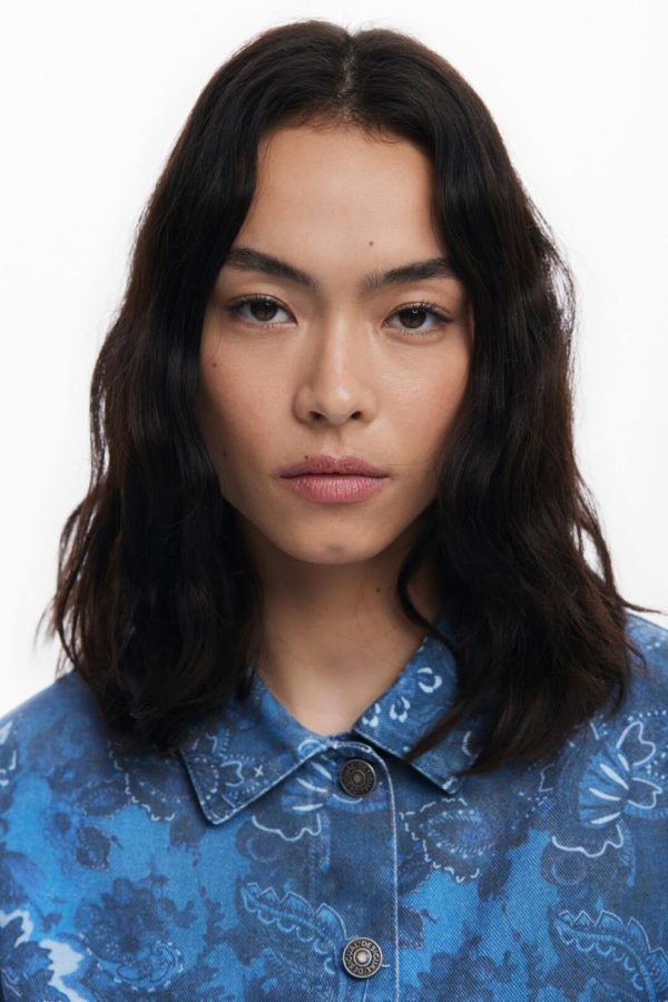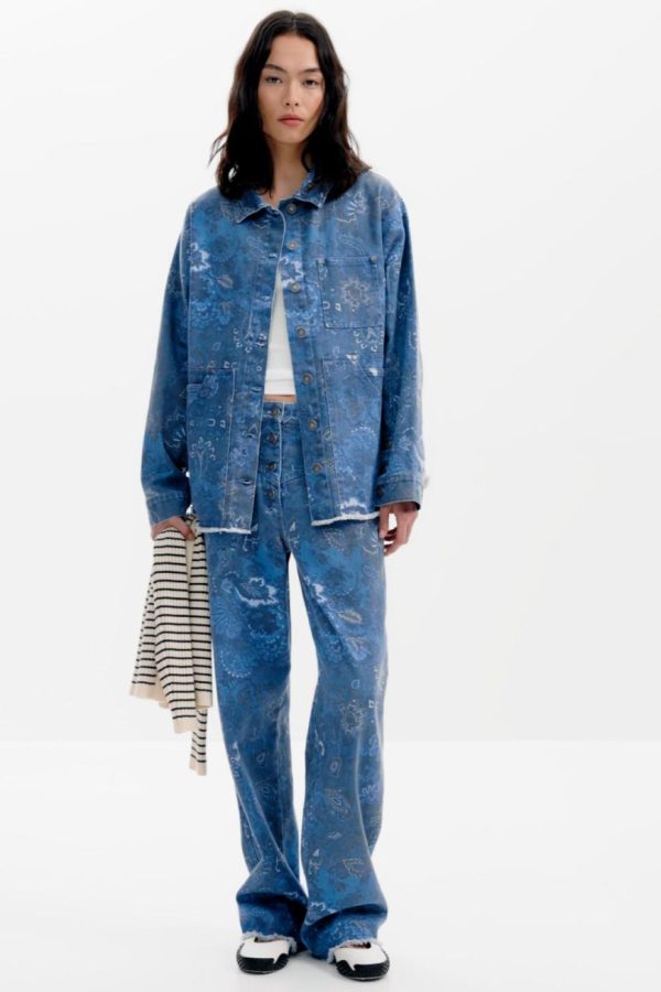 Trucker-style jacket with front pockets, button closure, frayed hem, and Paisley print in blue tones.